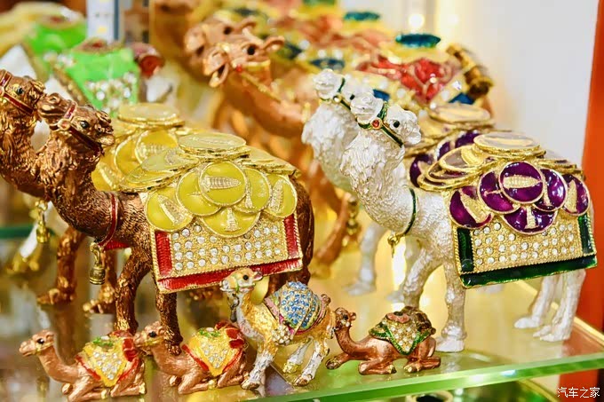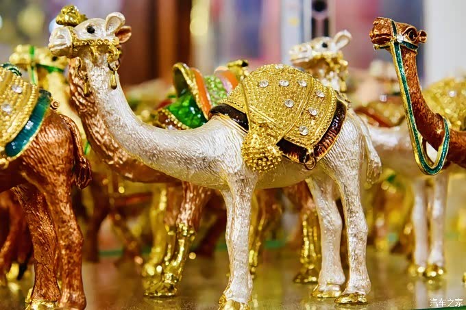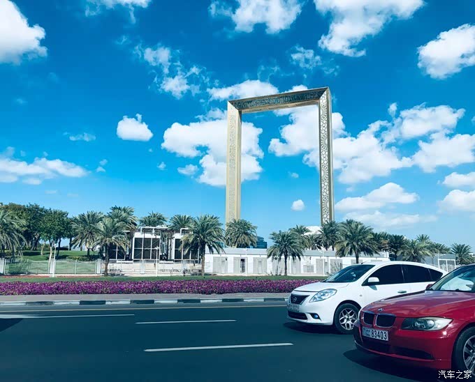 迪拜黄金市场里的黄金制品基本都是21K金,与其中一个店员聊起来,对方告诉我们因为21K金软度适合做出各种精美绝伦的造型,也没有24K金那么脆所以不容易折断。我们在黄金市场里除了被一件件精美的黄金饰品吸引着按下快门,也没有其他想法了。本来还打算去博物馆看一看,最后想了下还是选择坐上了回贸易中心区的的士,回酒店休整为下午和晚上的活动养精蓄锐这里提一下迪拜老城区路比较窄且车很多,打车不是十分方便,所以如果你接下来有行程安排,一定请提早做打车准备,避免耽误后续行程。回酒店的路上再次与迪拜金相框相遇,蓝天白云下真是好看