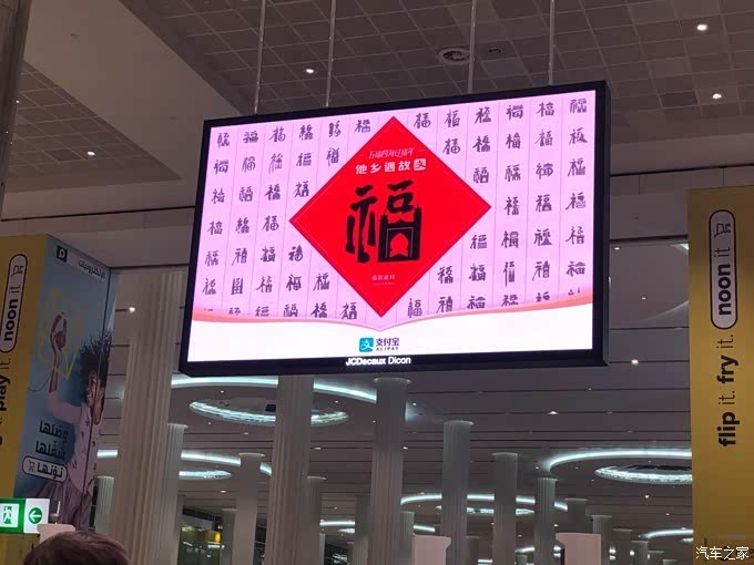 我拿着护照按照指示牌顺利到了关口,排队等待的时候满屏都是支付宝“他乡遇故支”的宣传。再就是庆祝中国新年快乐的祝福语,不知道的还以为我到了某个国内机场~
