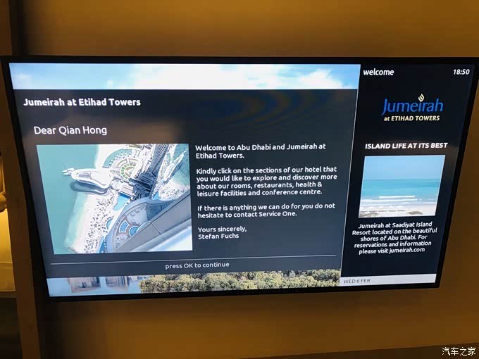 运气好的是酒店前台接待我们的是一位来自云南的姑娘,于是大家熟络的用普通话聊起来。聊到我们2月3日那天因为天气原因跳伞被取消的事情,姑娘说阿布扎比那天也是大风大雨的,她在阿布扎比待了半年第一次下雨,听起来更加觉得我们像中了彩票!!我们房间被安排在59楼,进到房间里电视屏幕上的欢迎语也显得格外贴心??