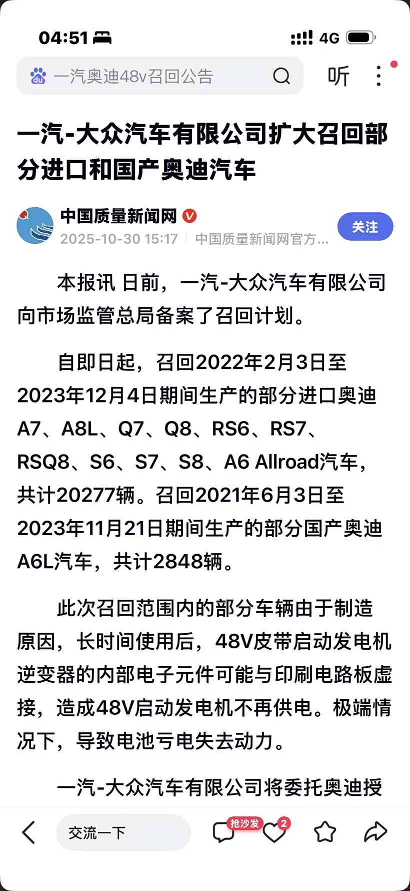 上周四出差,早晨司机送我去机场,我让他去保养一下车,正好四万公里了,他说已经和4s 点约好了,今天去更换发电机,公司要求召回。我路上顺手网上搜了一下,还真有这个事。