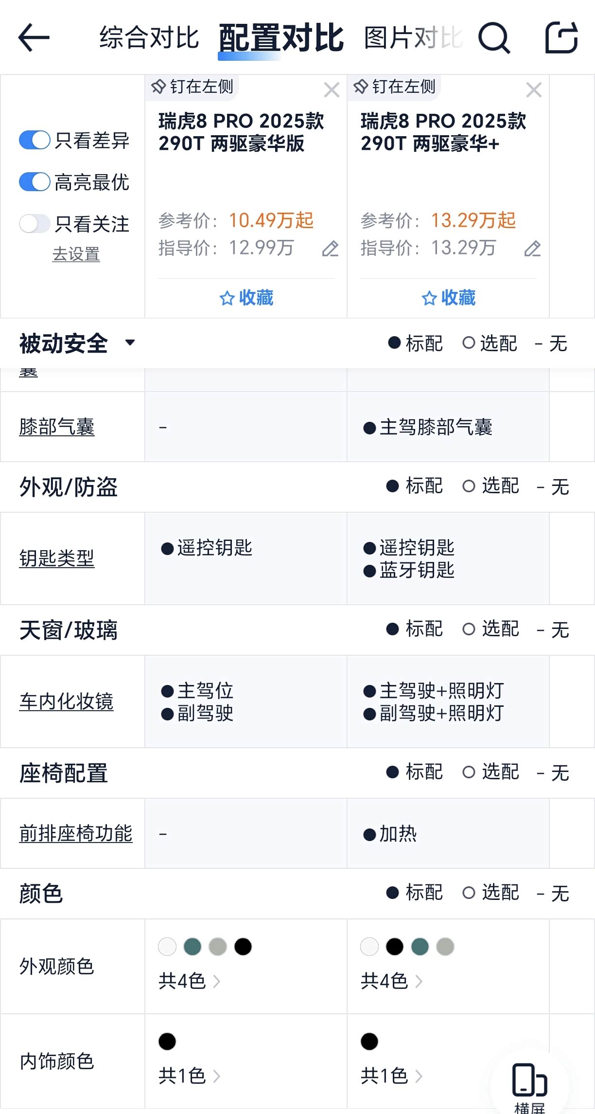 2.看重安全与舒适配置:豪华+安全配置更全面,还有前排座椅加热、手机蓝牙钥匙等舒适便捷配置,预算充足且对配置有要求的话,选它准没错。