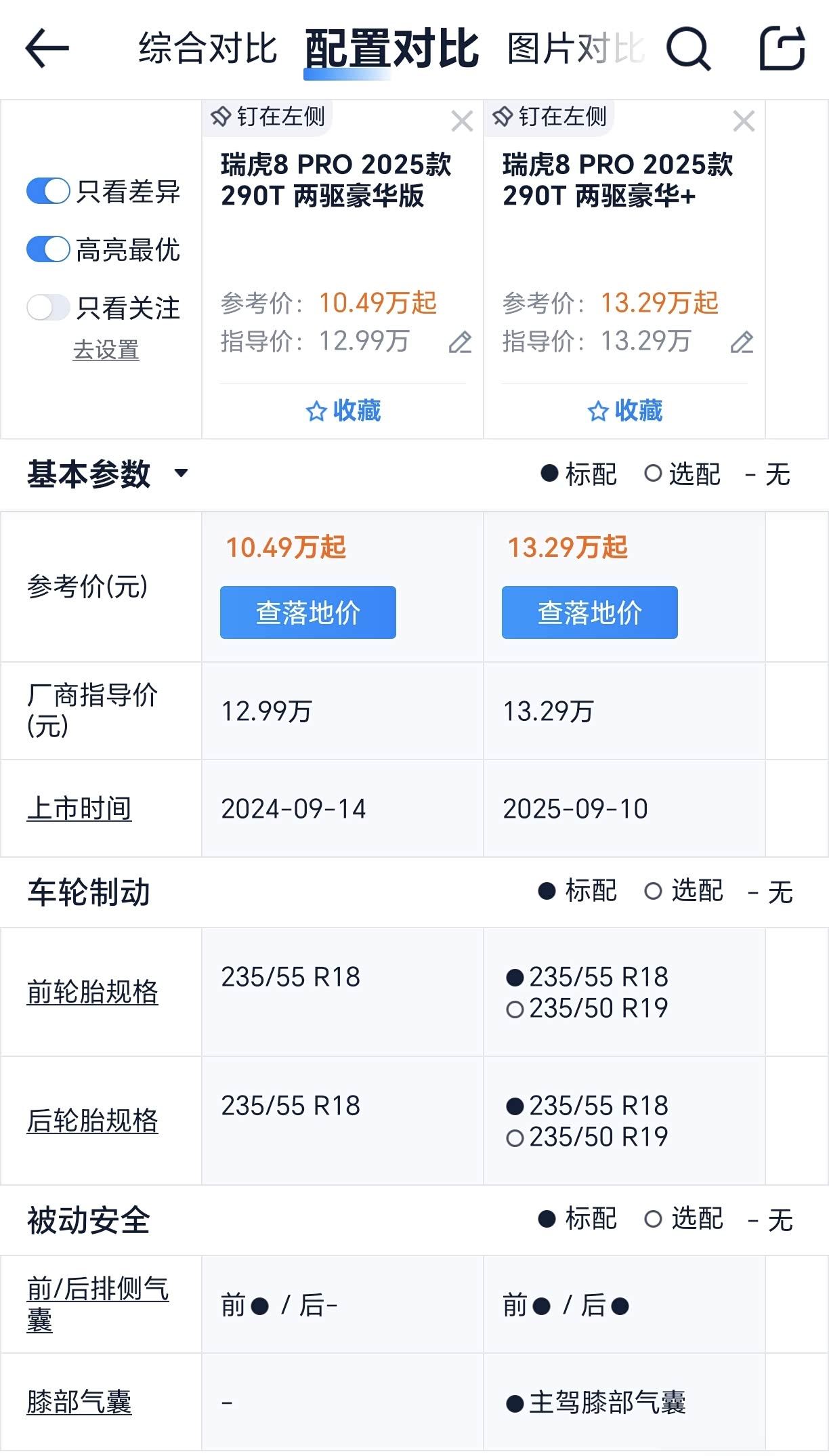 从配置对比图能看到,豪华版经销商报价10.49万,相比指导价优惠了2.5万,优惠力度很大;而豪华+经销商报价暂时和指导价一致,没有明显优惠。