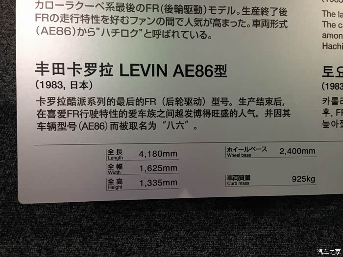 这就是当年的AE86,当时前置后驱的代表。 看了看下面的解释,才发现“LEVIN雷凌”这个名字居然在那个年代就开始用了。而且还是86当年的名字!