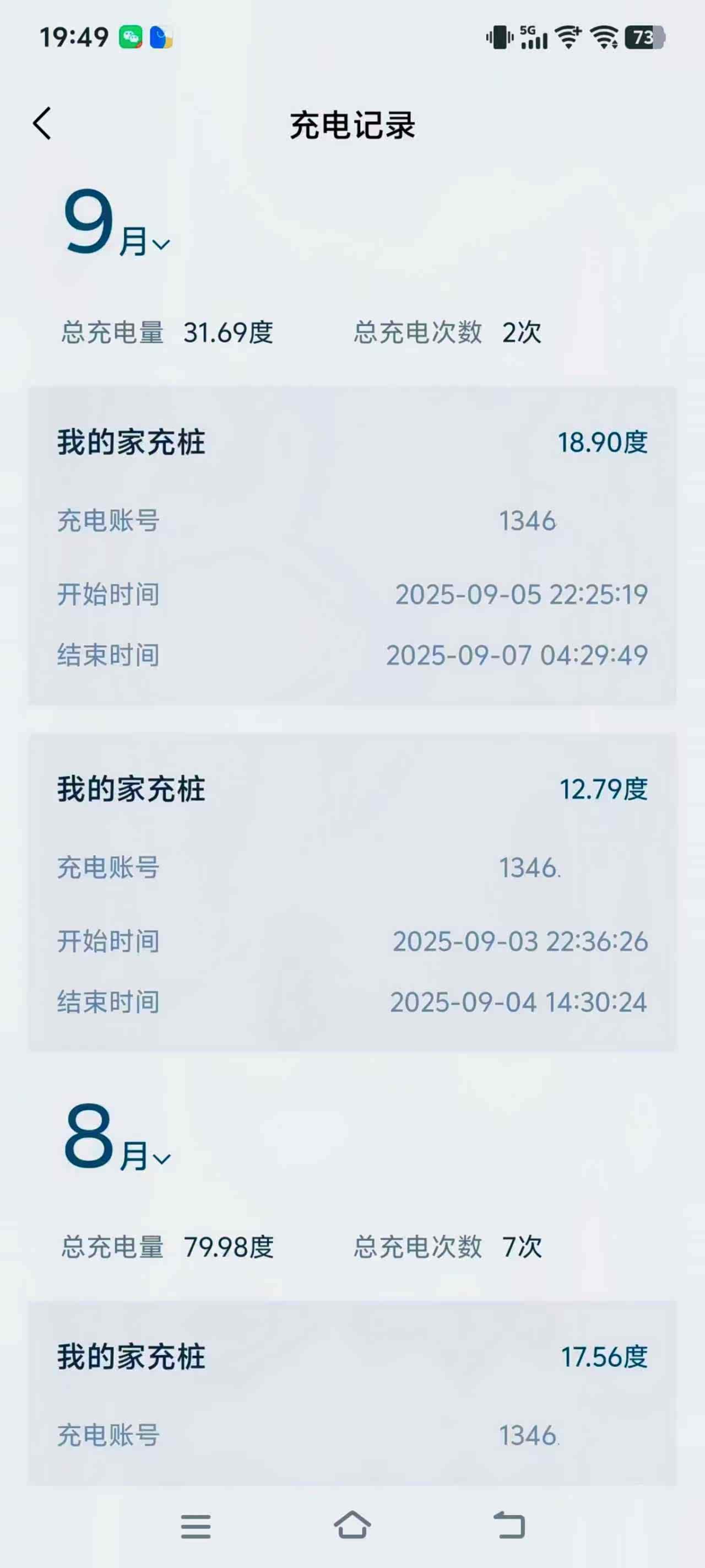 装好家充桩后App里统计的8月~9月的充电度数合计。