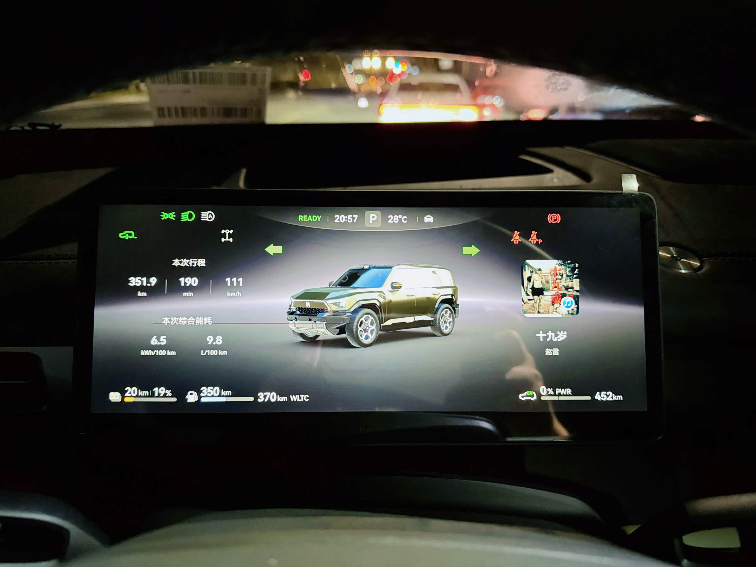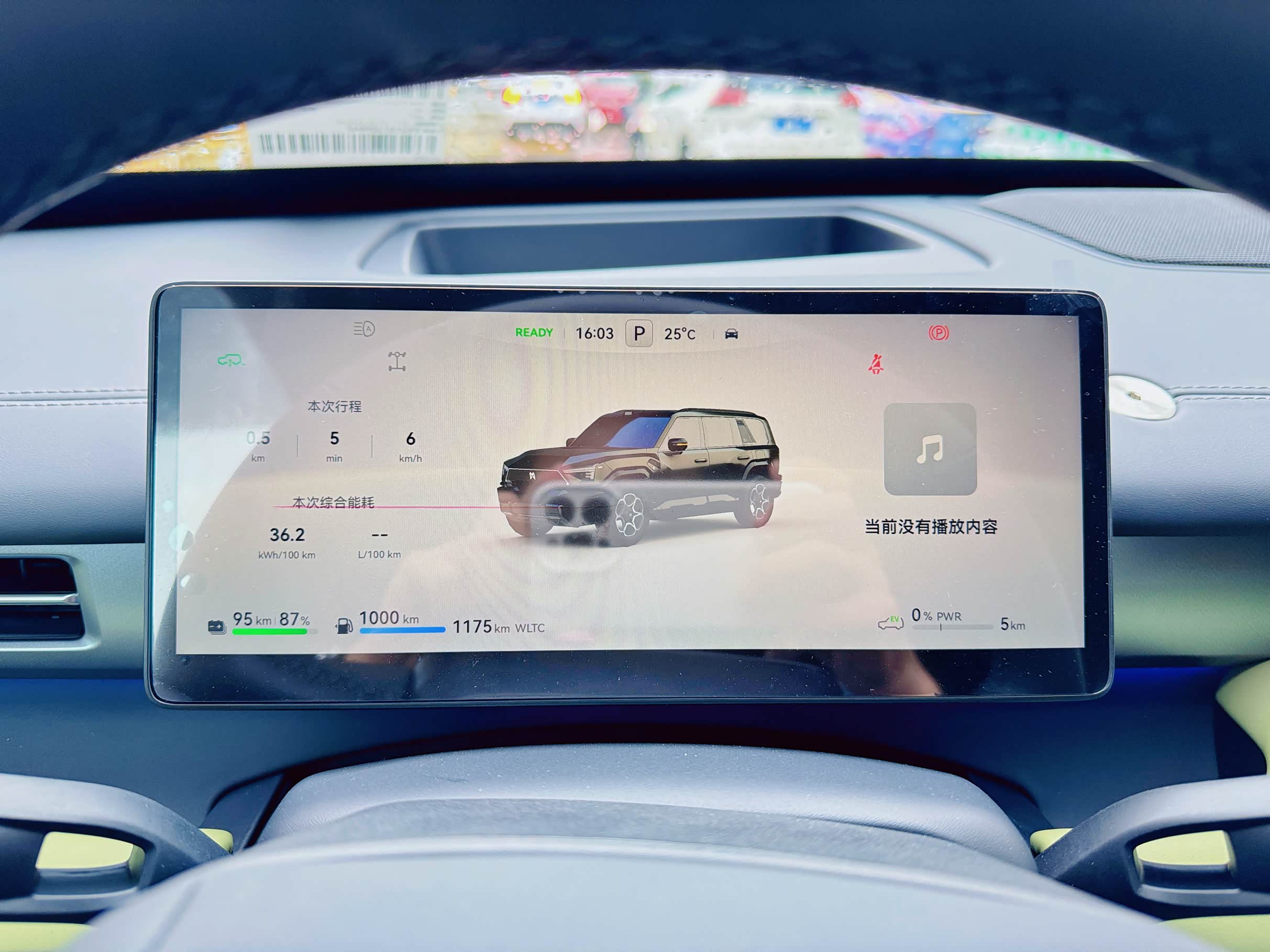 由于是拖去办入户手续,一直开着空调等手续,所以此时总的公里数还是5公里,但电量从98%变为87%。表显的电续航里程95公里,满油续航1000公里(表显的油续航数字妥妥的出道即巅峰,后续估计达不到这个高度了)WLTC标准下电(95公里)+油(1000公里)合计数本该是1095公里,但至今没搞懂为什么表显1175公里?我虽然数学不好,但我会用计算机求和啊。