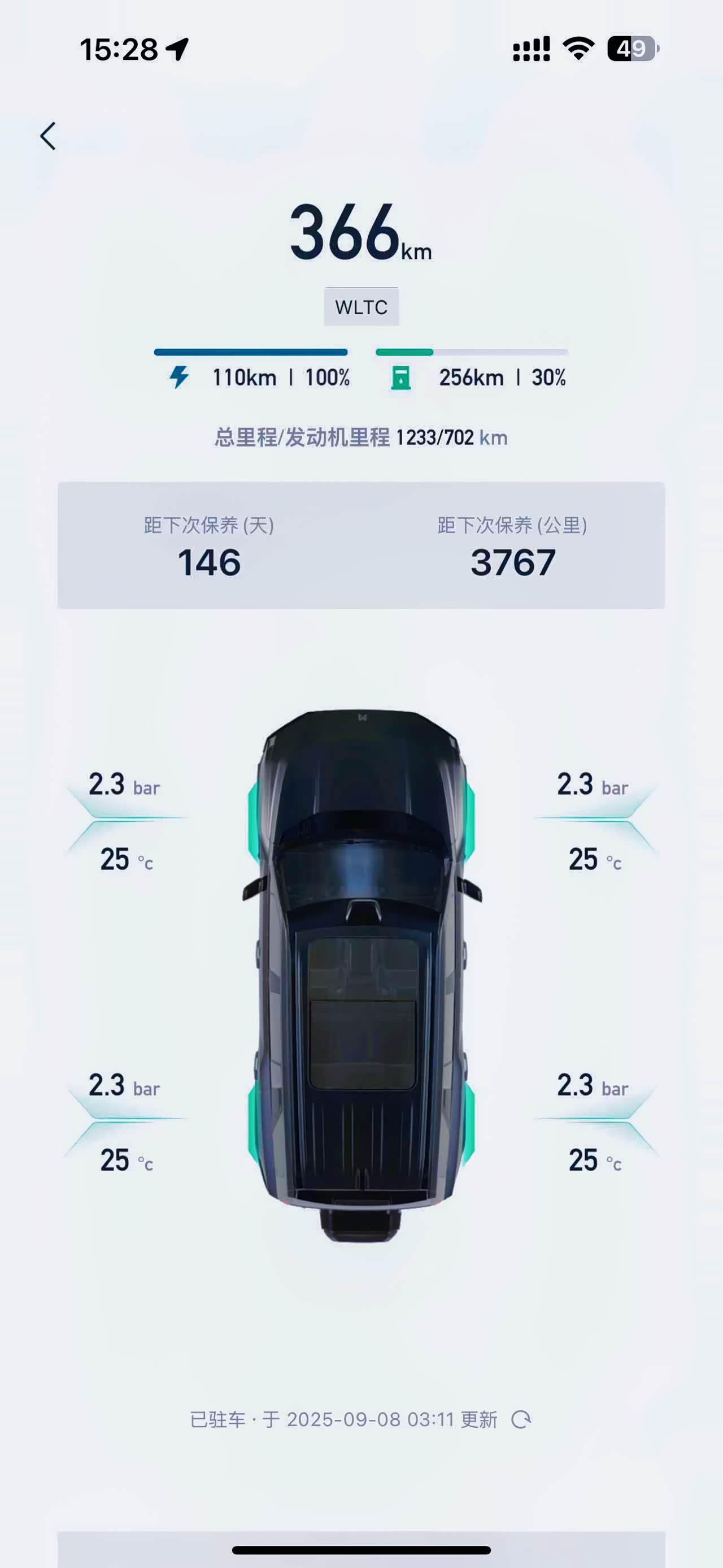 提车时表显油续航282公里,止于9.8号油续航里程256公里,APP里显示30%油,约等于提车时油量。
