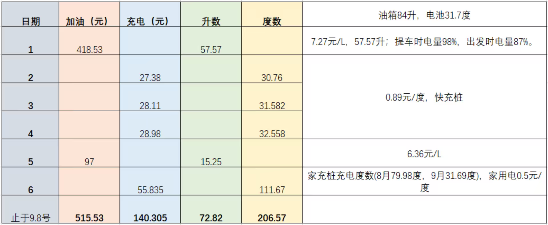 3、按实际花费:加油515.53元+实际电费140.31元=655.84元,约0.53元/公里,油价(7.27+6.36)/2=6.82元/升,油耗为7.77L/100km;
