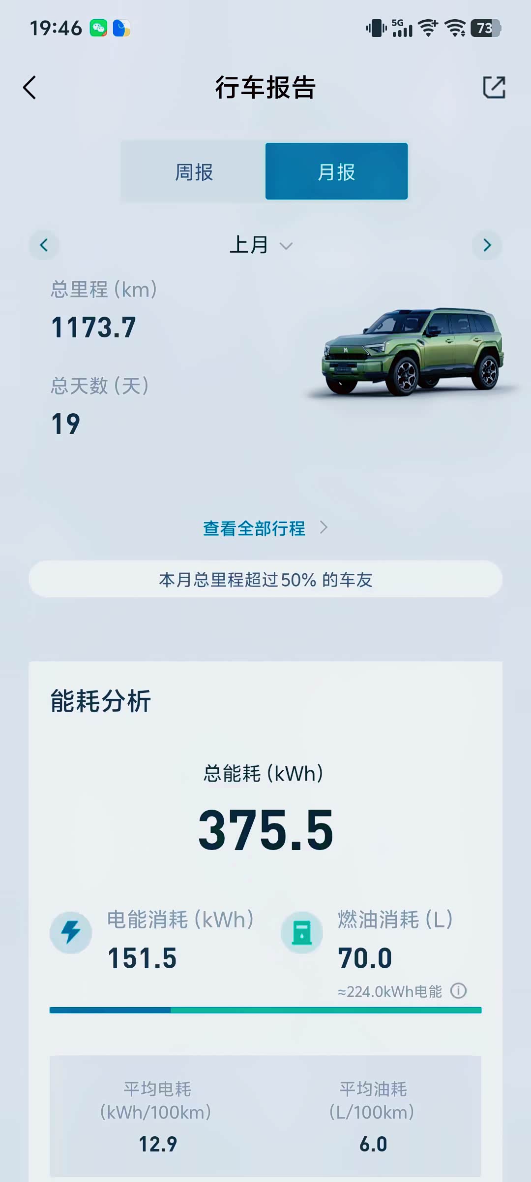 8、车机里的能耗报告页面只显示总里程,油和电里程需到App里查找,不够一目了然;