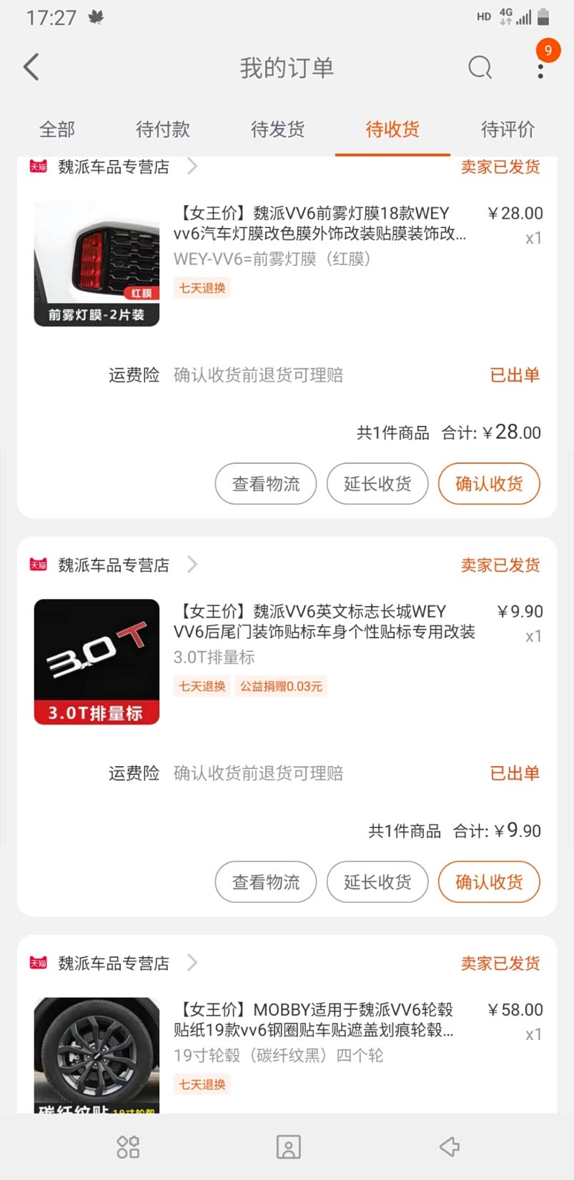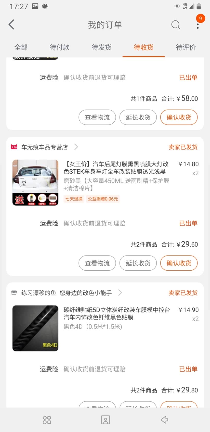 过年去三亚玩了一趟,买的黑色碳纤维尾翼还没到,轮毂贴没到,碳纤维门把手没到,全淘宝买不到前铲,正在等货