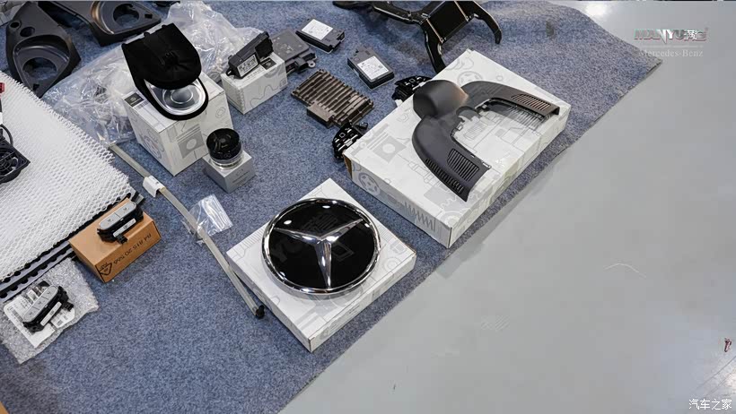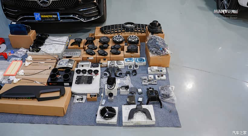 ▲ 原厂3D大柏林配件:25个扬声器、2个大小功放(1610W)、A柱高音发光盖板、眼镜盒高音盖板、顶棚柏林盖板、门板低音盖板、原厂线束