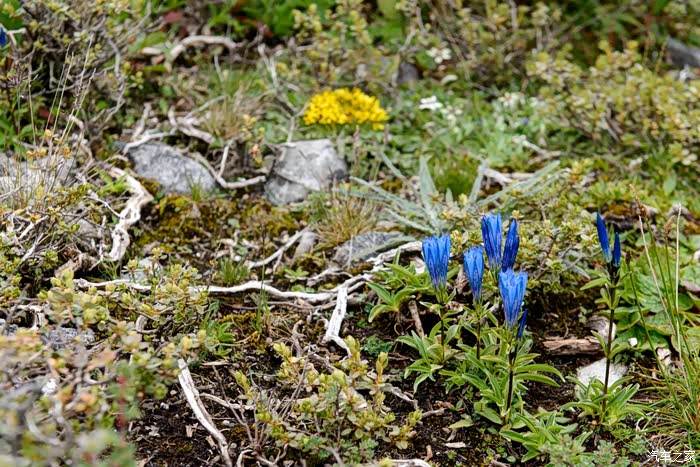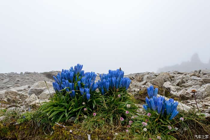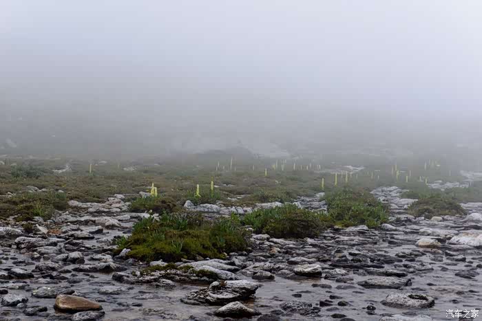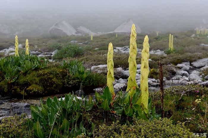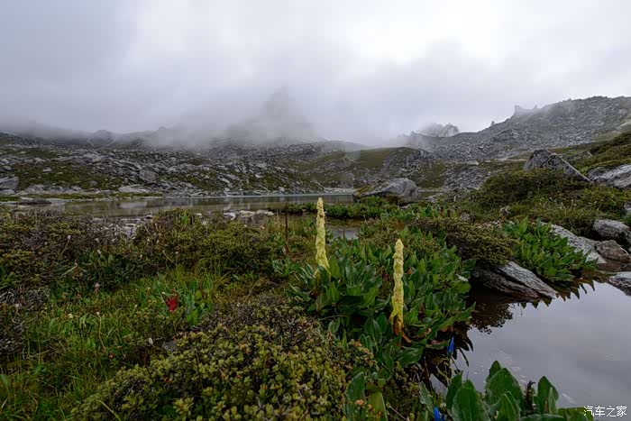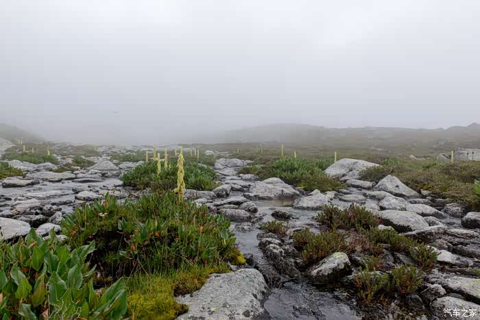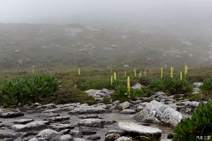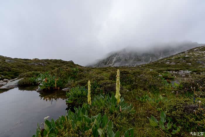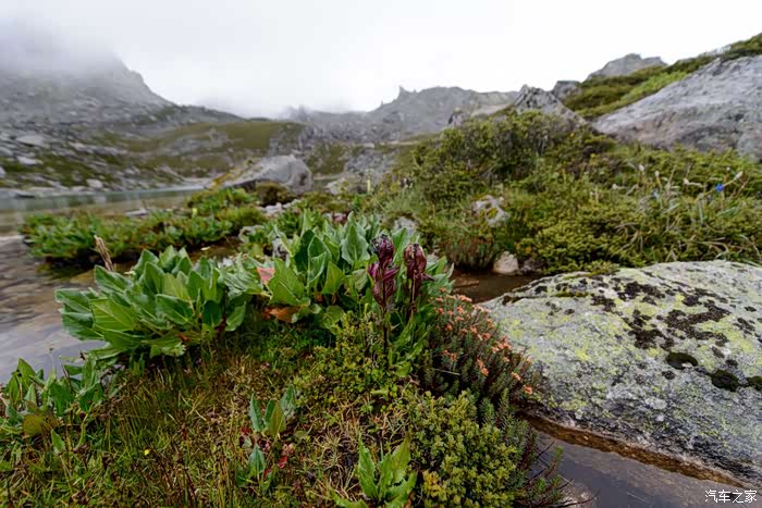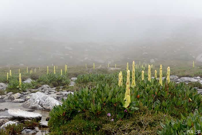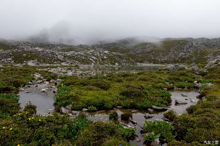 路线上有6-7个海子,水质清澈。路边开放各种野花,水黄、绿绒蒿、龙胆、报春、风毛菊、杜鹃、银莲花……雾气忽来忽去,忽聚忽散,仿佛仙境。