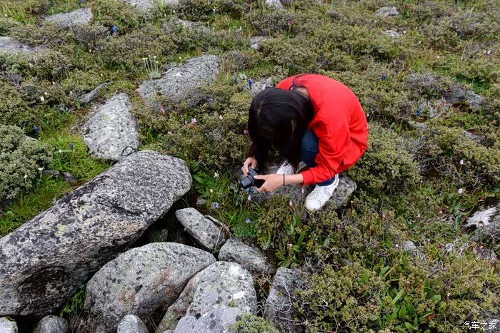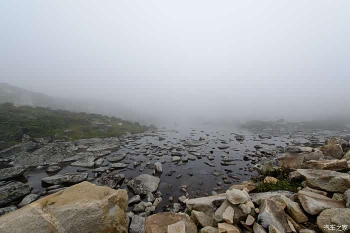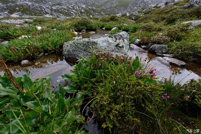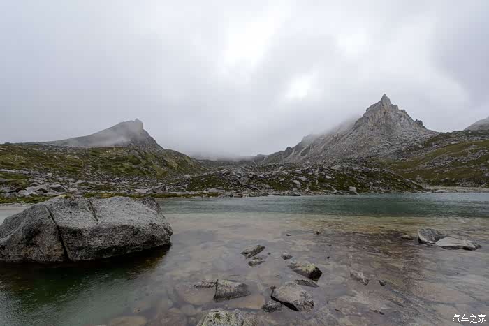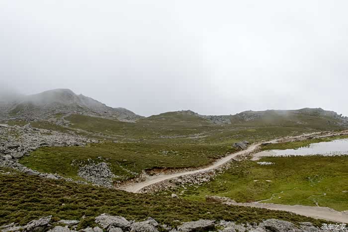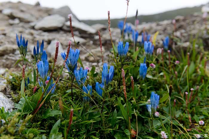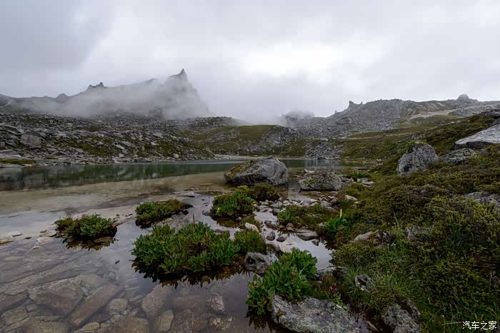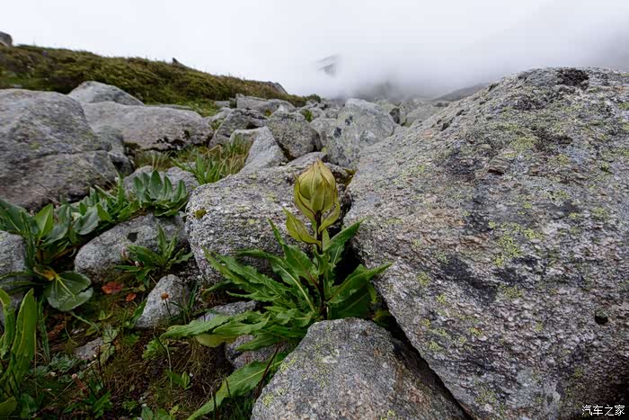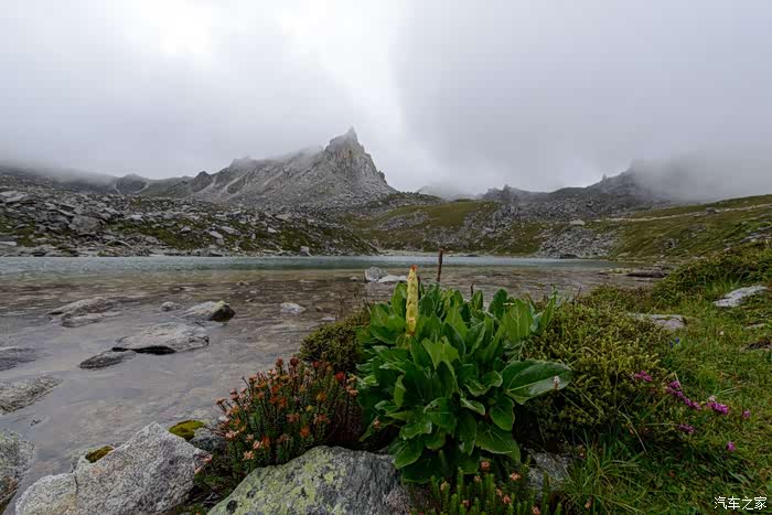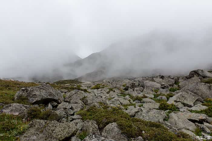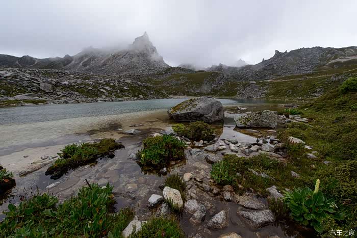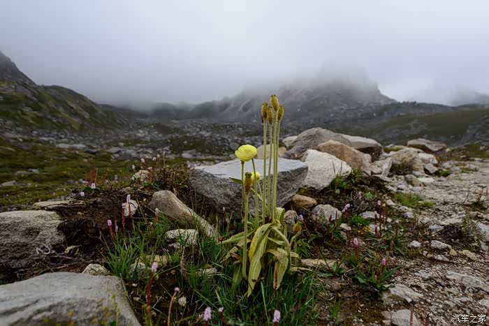 路线上有6-7个海子,水质清澈。路边开放各种野花,水黄、绿绒蒿、龙胆、报春、风毛菊、杜鹃、银莲花……雾气忽来忽去,忽聚忽散,仿佛仙境。