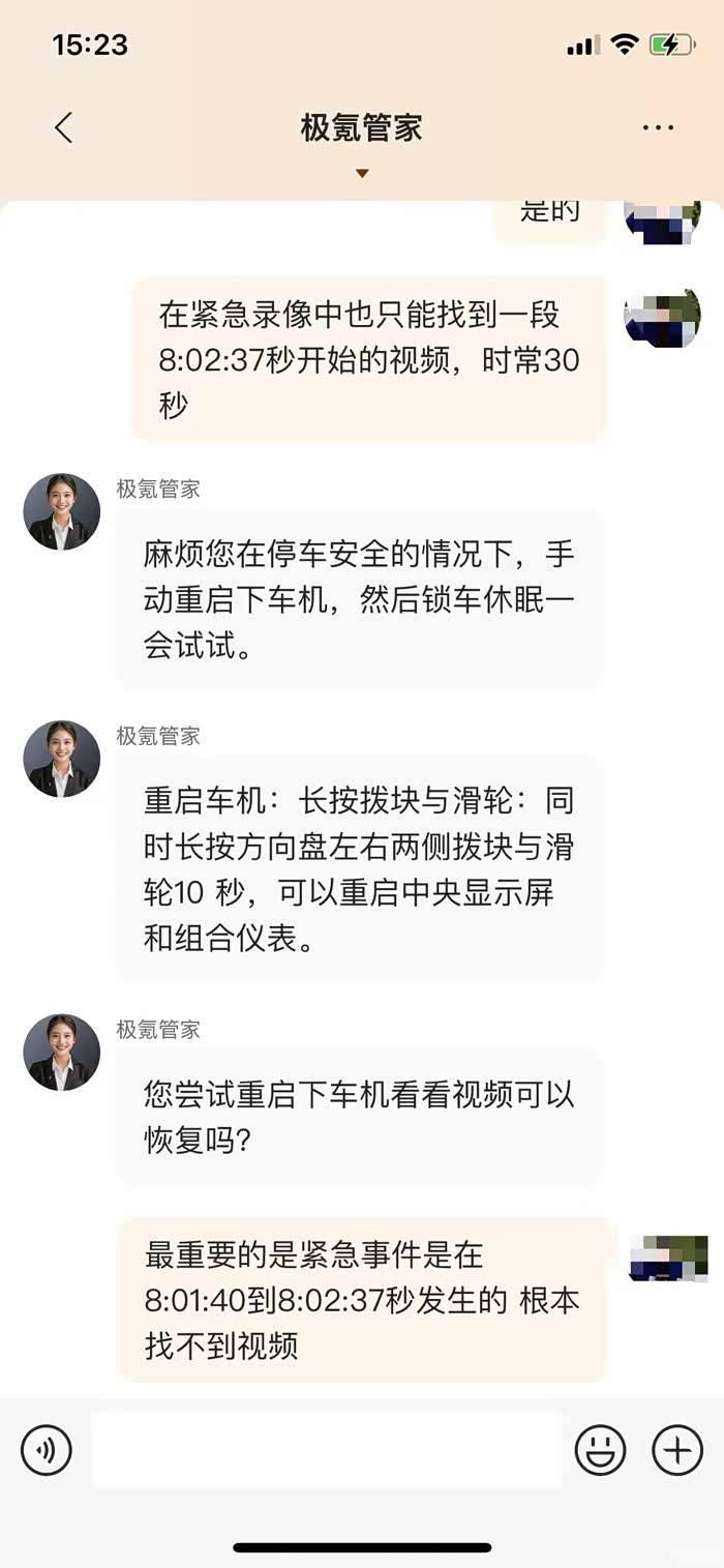 行车记录仪视频不全我也遇到过,老头骑三轮车横穿马路我紧急刹车,幸好没有碰上,但是事后就是找不到这一过程的视频,找了客服就是让重启车机,并没有任何用。