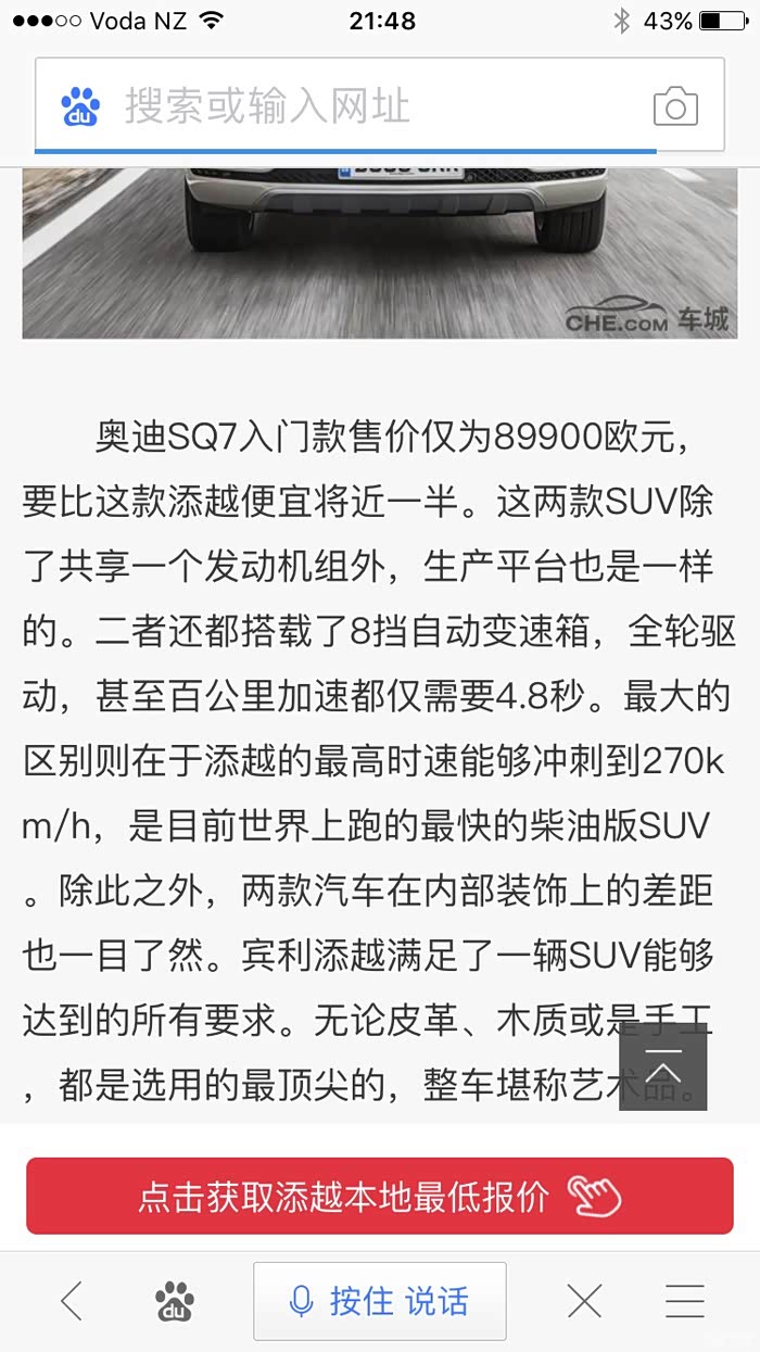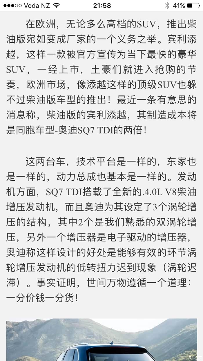 倒贴的名字很有意思《85青年海外成功购的奥迪SQ7》,好吧你把我的岁数猜错了,买个车不用成功不成功的,好像很难似的。交了钱,上牌,手续都交给车行了,也不用去什么检测所什么的,很简单,当天交钱就开走了。车子带后排隐私玻璃,所以只帖了前门的膜。销售说,德国不让帖前门的膜,新西兰可以,我也想把前挡贴了,销售说本地法律不容许。后来车身有镀了车衣还是车膜,说是for life,保终生。终生不用换膜打蜡。我不知道是不是被奥迪店忽悠了,反正我觉得贴完挺好,大概800纽币,外面贴好像更便宜。