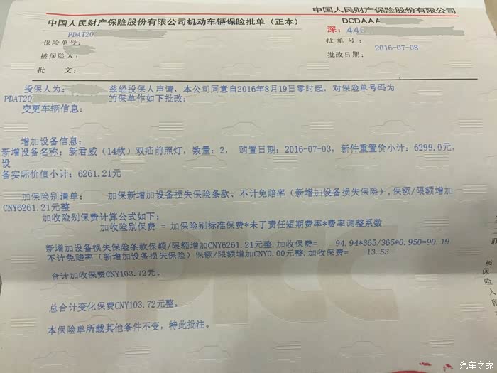 3、大灯属于易扣件,特别是追尾别人的时候,所以带发票,加投人保的“新增设备险”,103块搞定,安心