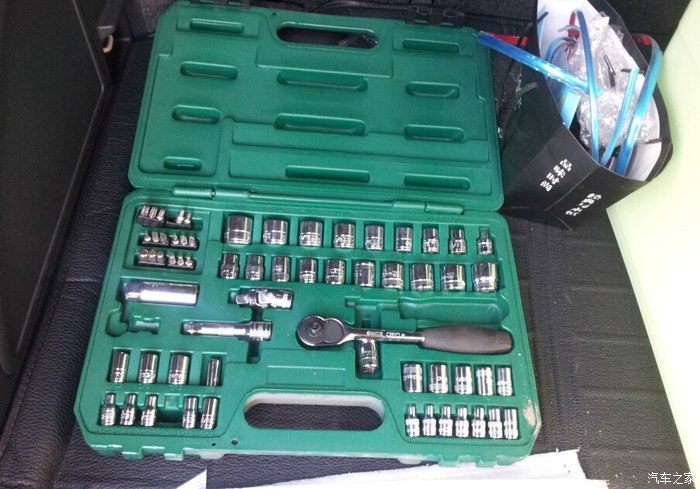 防撞梁的基座固定螺丝,里面那个不太好上,手小的才伸的进去转。有套筒工具最好,我这套工具里有智能扳手很给力没有的话用13号固定扳手慢慢转。。。。防撞梁用12号扳手(活动扳手也好整)。