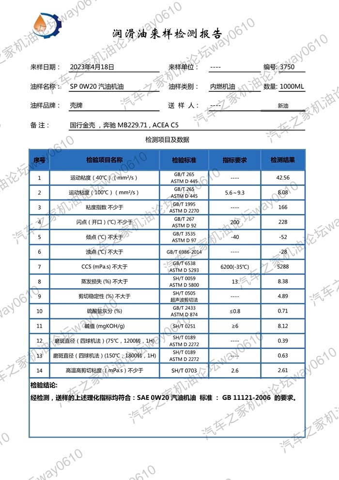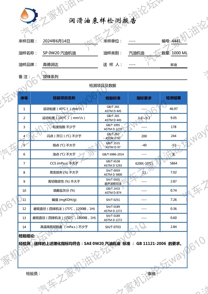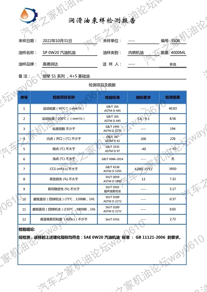 检测只对样品负责,检测为个人兴趣爱好,数据请谨慎参考,样品由论坛车友提供,一升装未开封新油。