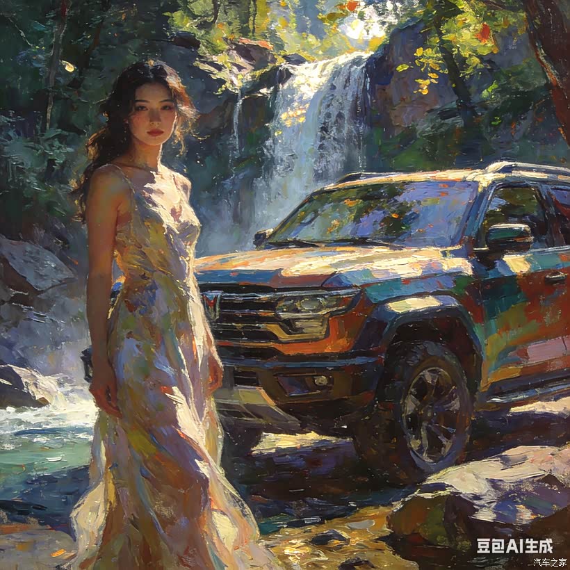 最后一站是山林瀑布,她穿一身长裙站在水边,阳光穿过树叶洒在身上,画面像油画一样温柔,越野车就安静待在旁边,陪着我们享受这片刻的治愈。