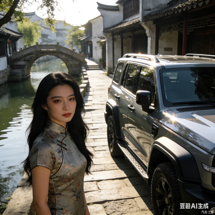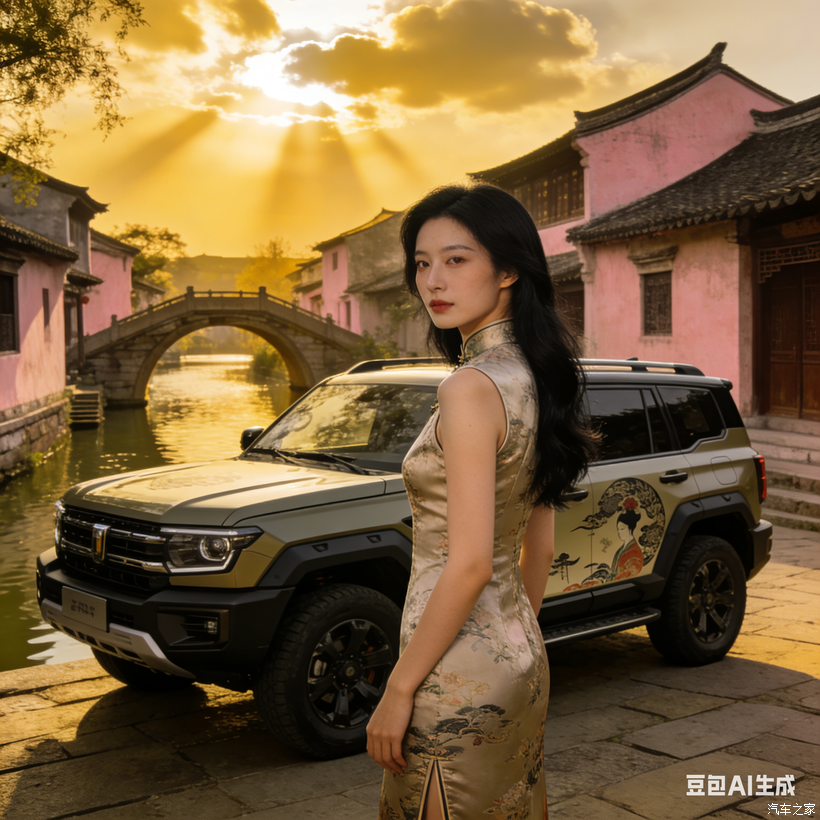 第一站是江南水乡,清晨的石板路还带着湿气,她穿一身素雅旗袍靠在车边,小桥流水衬着银灰色的车身,古典柔美和硬派越野撞出了不一样的火花。等到傍晚夕阳染红了粉墙黛瓦,她换了香槟色旗袍,车身上的国风彩绘也跟着发亮,画面暖得让人想陷进去。