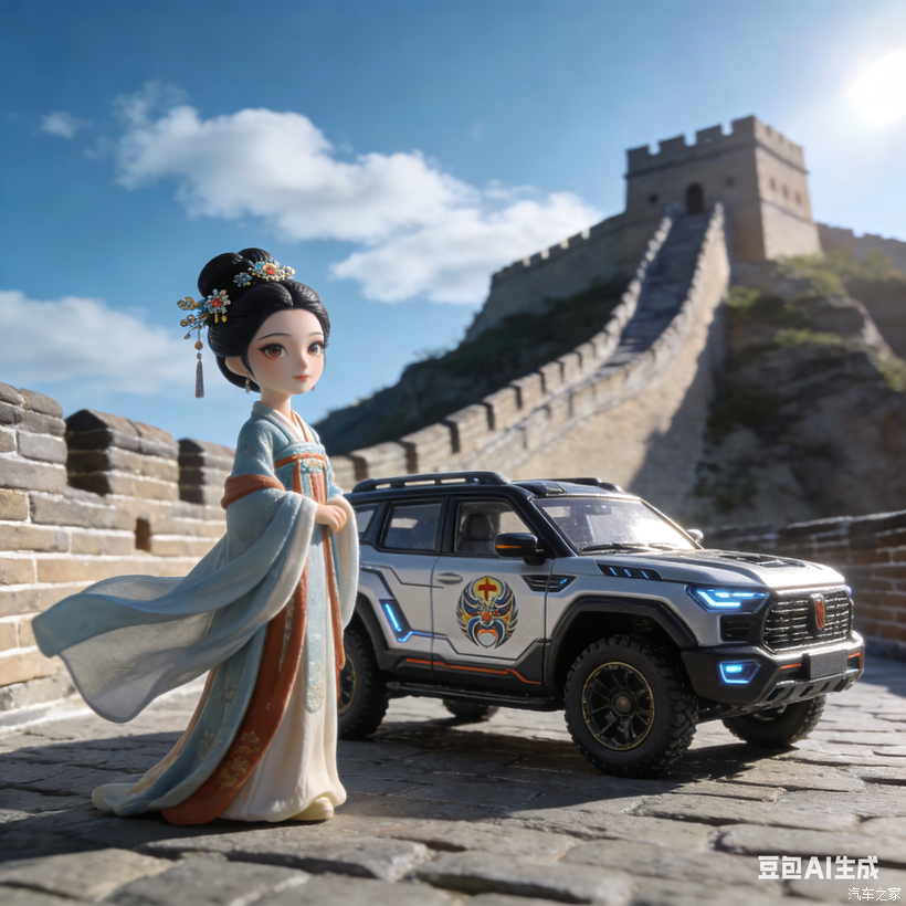 接着我们冲去了沙漠,她换上黑白拼色的户外装,长发在风沙里飞起来,越野车就像头钢铁猛兽趴在沙丘上,那股又酷又野的劲儿,看得我直呼过瘾。后来还去了长城,她穿一身汉服站在城墙上,裙摆随风飘得老远,机甲风涂装的越野车和古城墙遥遥相望,就像一场跨时空的浪漫。