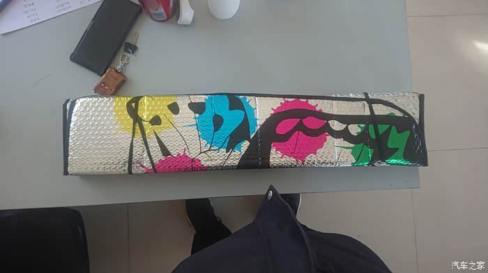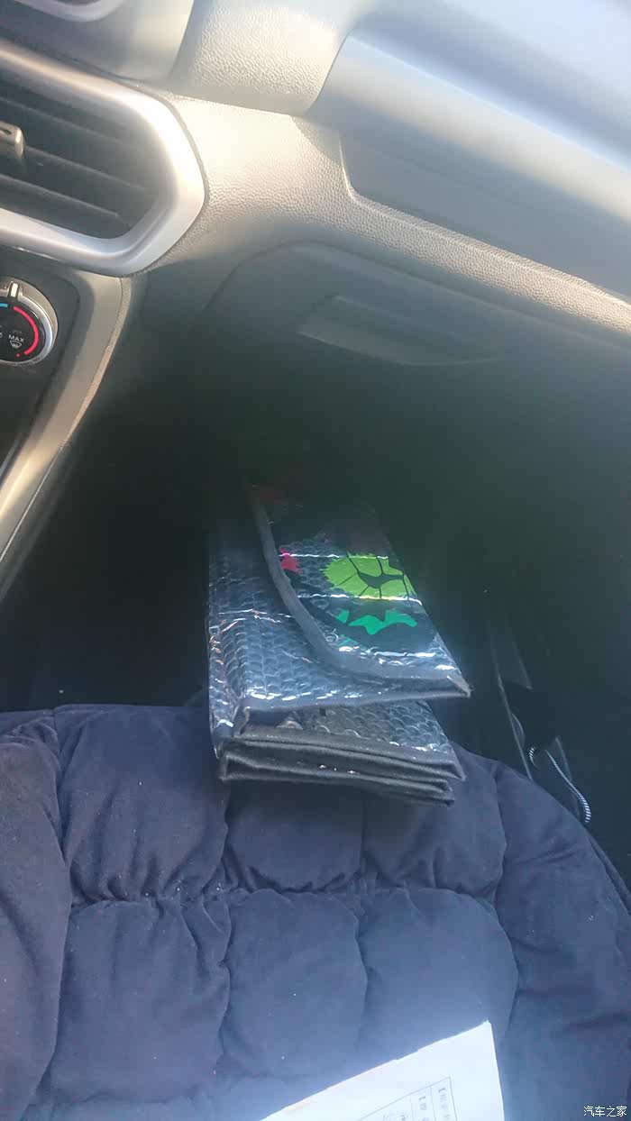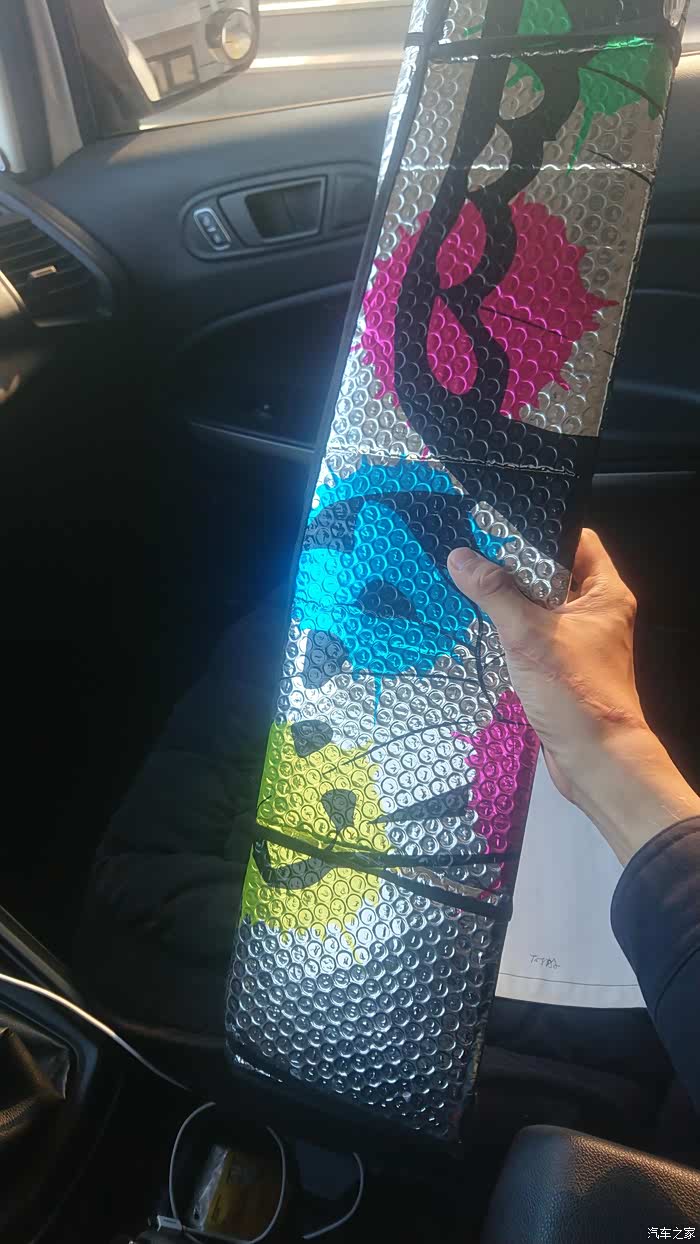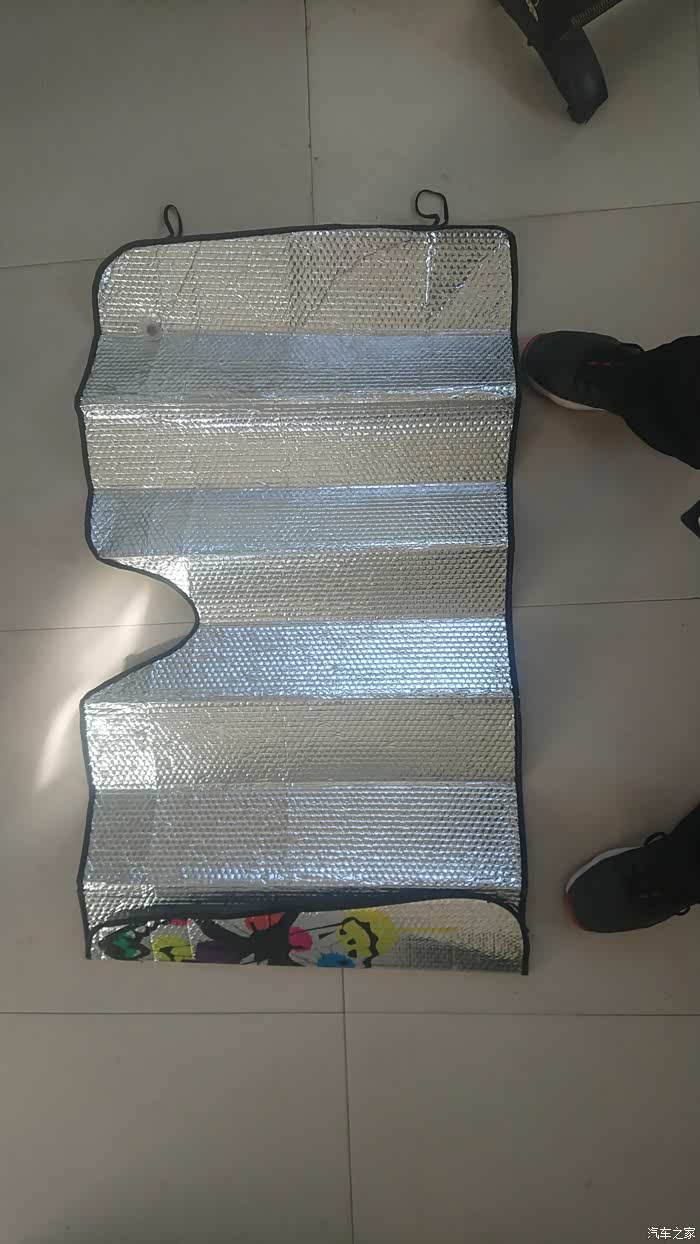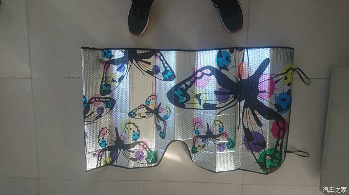 遮阳挡的正面有一些图案,虽然我不知道画的是什么但是觉得还很好看。上面有两个孔可以放吸盘粘在风挡上固定。但是我比较懒加上前风挡比较小,就直接用遮阳板固定了。