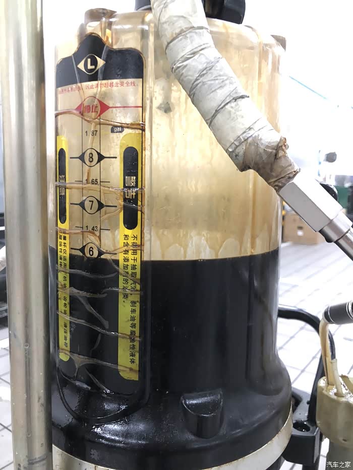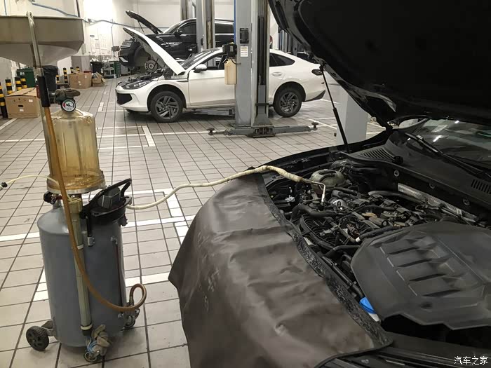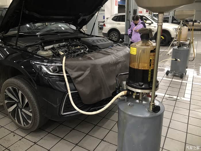到达保养工位,为了放心一些,每次保养我都是看着师傅做的。师傅问我驾驶车辆有没有任何问题,并开始了换油工作。师傅打开发动机盖板,更换了机油滤清器,拧开加油盖,拔出机油尺,将抽油机的抽油管插进机油尺的孔就开始抽油了。为了节约时间,师傅对我的四个车轮进行了胎压矫正,让车辆轮胎处于标准胎压。抽完废机油,罐子里废机油容量差一点6L,属于正常范围;师傅拿出金色桶机油(全合成),加入了发动机中。随后进入驾驶位,将车辆保养数据复位。