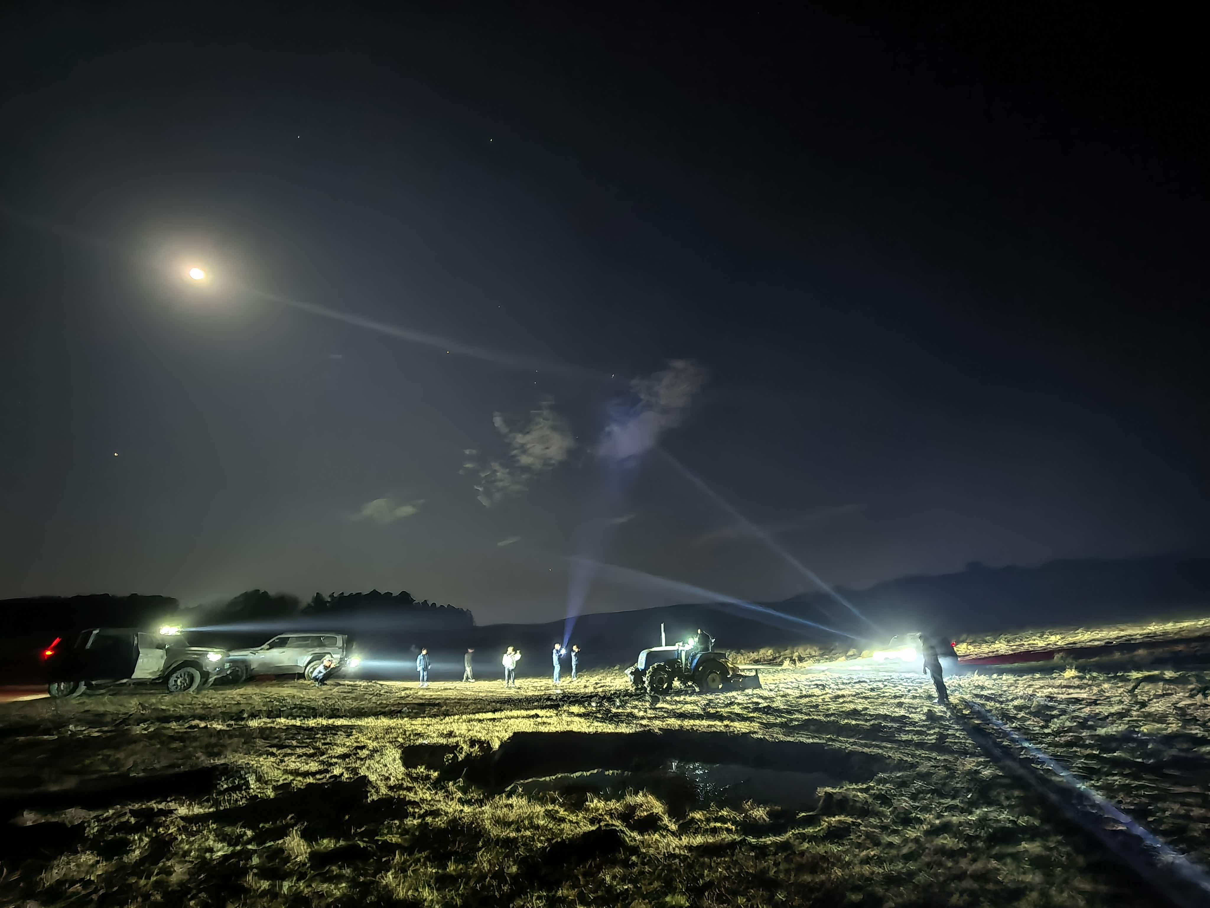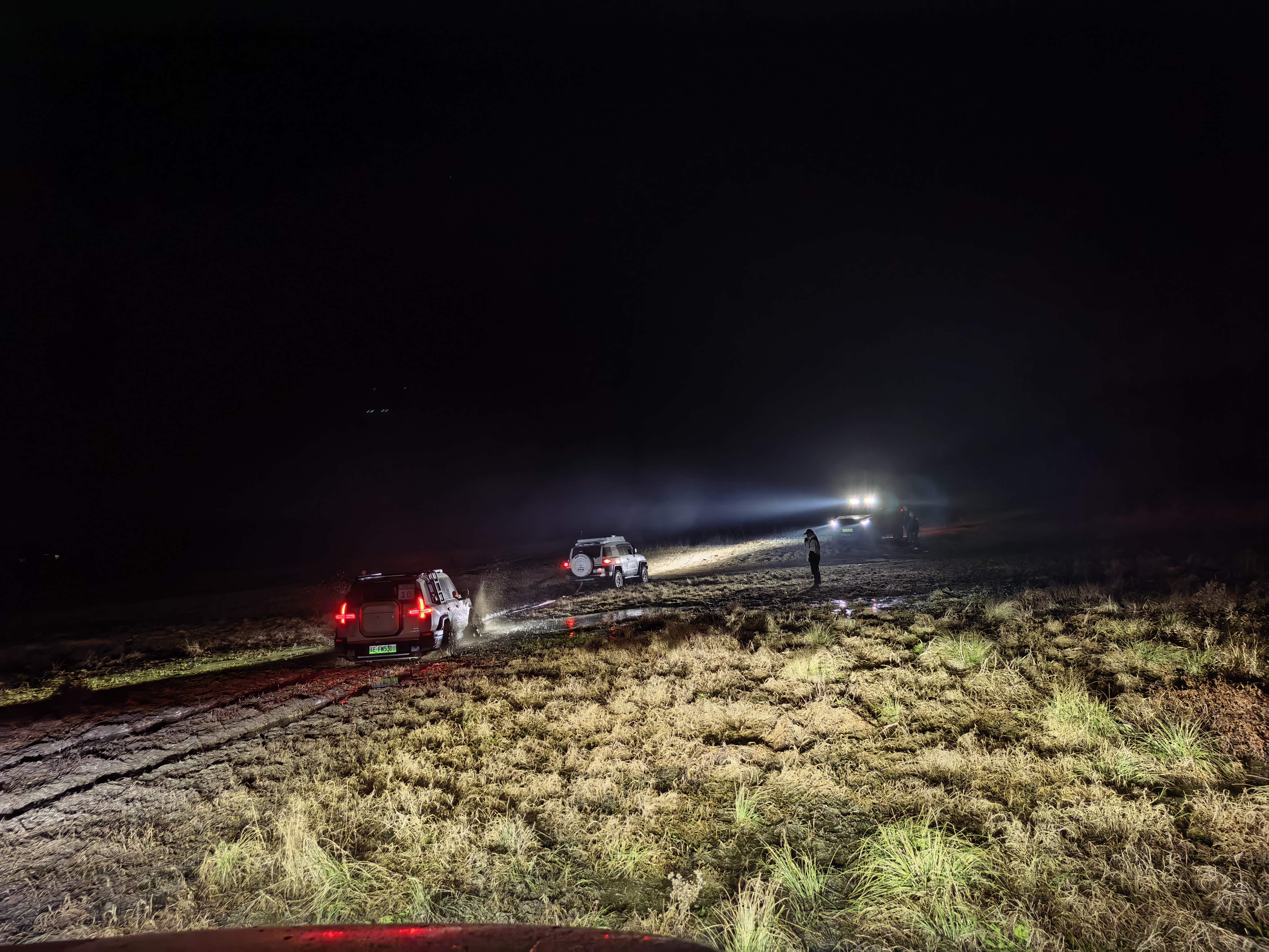 。这个沼泽地原来是个小河滩,现在正值枯水期,明面上除了零星几个小水塘外,看起来似乎就是一片枯草地,然而等到前面几部车过去了之后,河床开始露出了“狰狞”面目,河底下的淤泥不断涌出地面,竭力滞留前进的车轮,制造一个又一个泥潭陷阱,最终在猛士M817大部队回撤过程中让5辆车成功陷车了。这个时候保障车猛士917上场了,在拖第4辆车(这辆车陷的比较深而且托底,车底盘被淤泥吸住了)的时候备用的2根拖绳拖断了,当时天已黑, 我和我内人困在第5辆车里(车门两边都是水,无法下车),我跟内人商量后跟领队说先让大家回去吃饭和买拖车绳,我们留守现场等待救援。