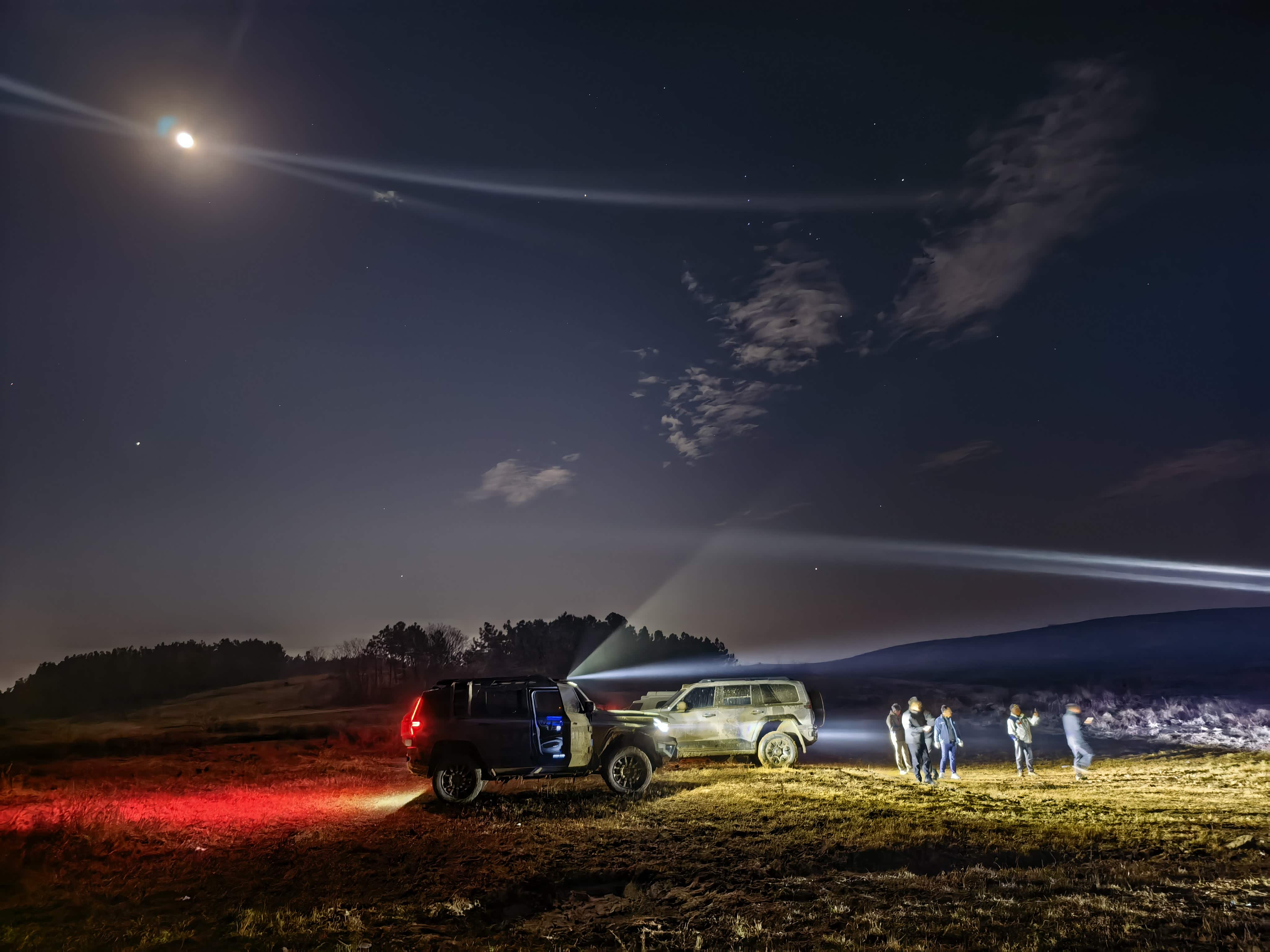 当救援现场的喧嚣热闹如潮水般退去,只留下荒野的寂静,为了节省电力,关闭了电门,高挂天边的圆月散发着清冷的光辉,月光透过糊满泥巴的车窗洒在我和内人的身上,我和内人默然相对,享受着难得的独处时光。良久,内人幽幽启声:“好久没有看到这种没有灯光污染的圆月和广袤的星空了,那还是以前小时候的记忆了,真想在这里露营”,我闻言心中一动,如果现在不是车陷沼泽,真的可以考虑在野外露营。猛士M817的后备箱空间完全可以扩展成2.1米的双人床,在车里透过大天窗看星空,和爱人相拥而眠,未尝不是一种另类的生活情趣