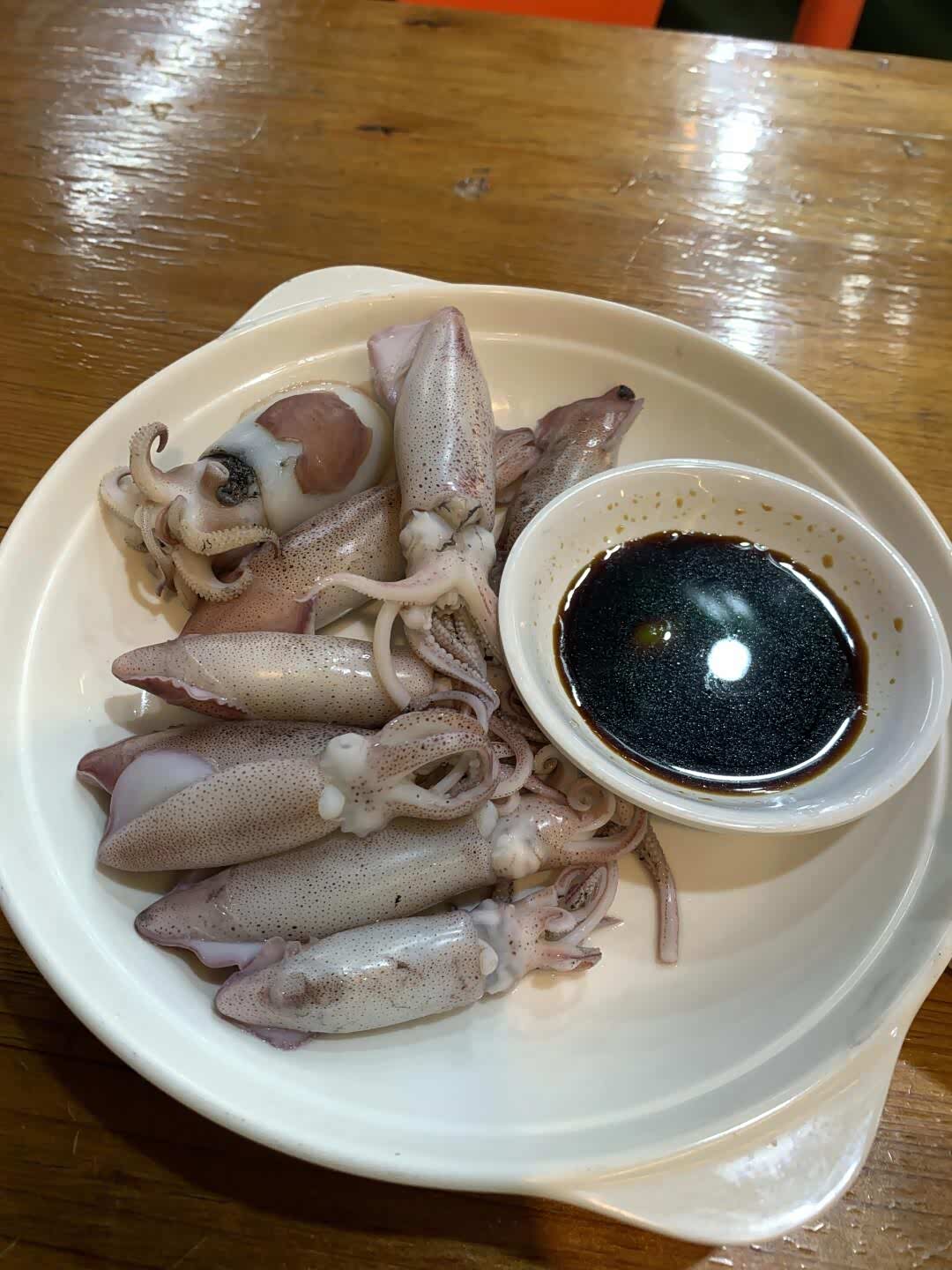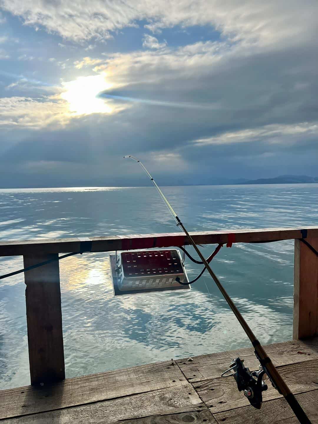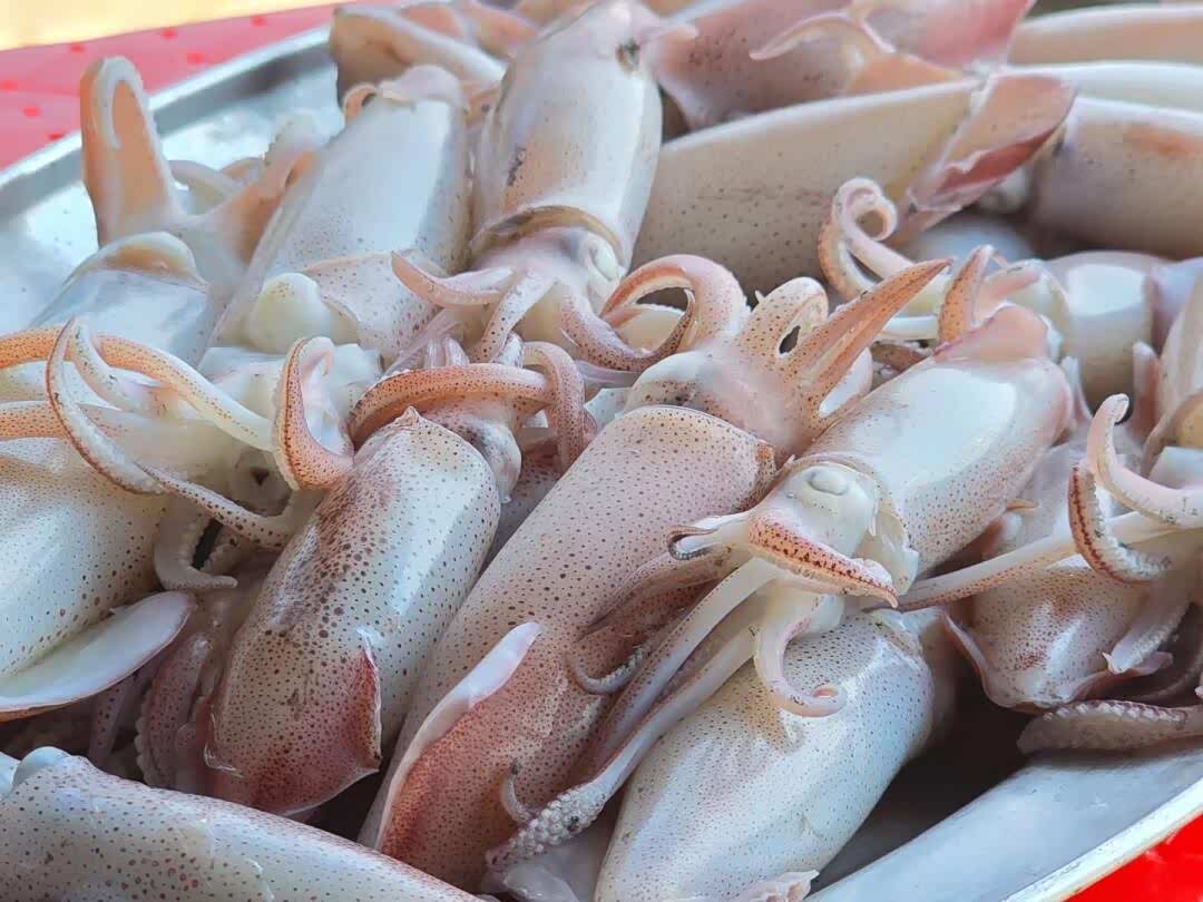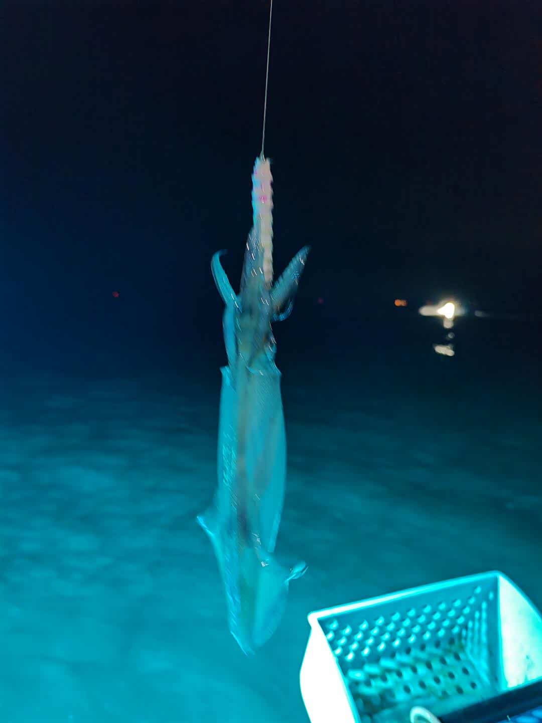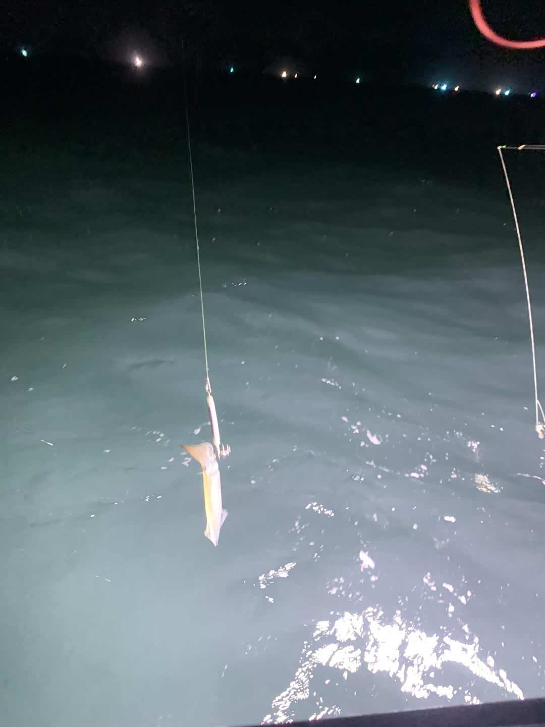 暮色渐浓,鱼排船头架起强光灯,蓝绿色光束刺破海面,成群鱿鱼从黑暗中游来,透明身体在灯光下泛着珍珠光泽。儿子握着儿童木虾钓竿,按阿叔指导有节奏地抽动,第一条鱿鱼被抄网捞起时,他兴奋得差点把钓竿扔进海里。女儿举着手机录像,惊呼鱿鱼在发光。