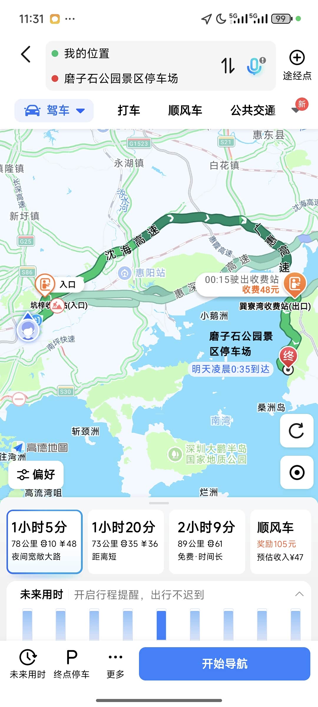 路线:巽寮湾渔港→广惠高速→沈海高速→深圳,全程约80km,耗时1小时,夜间车流少,路况平稳。