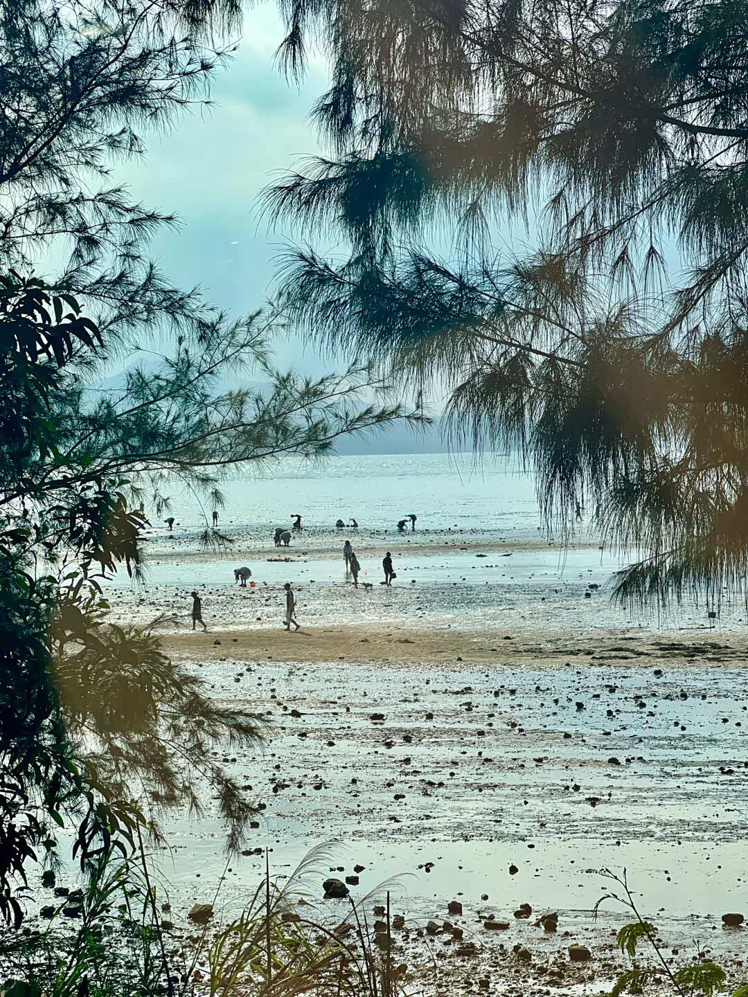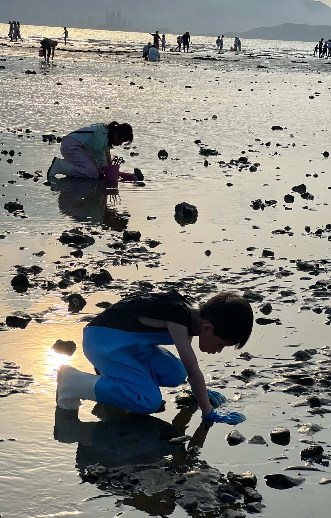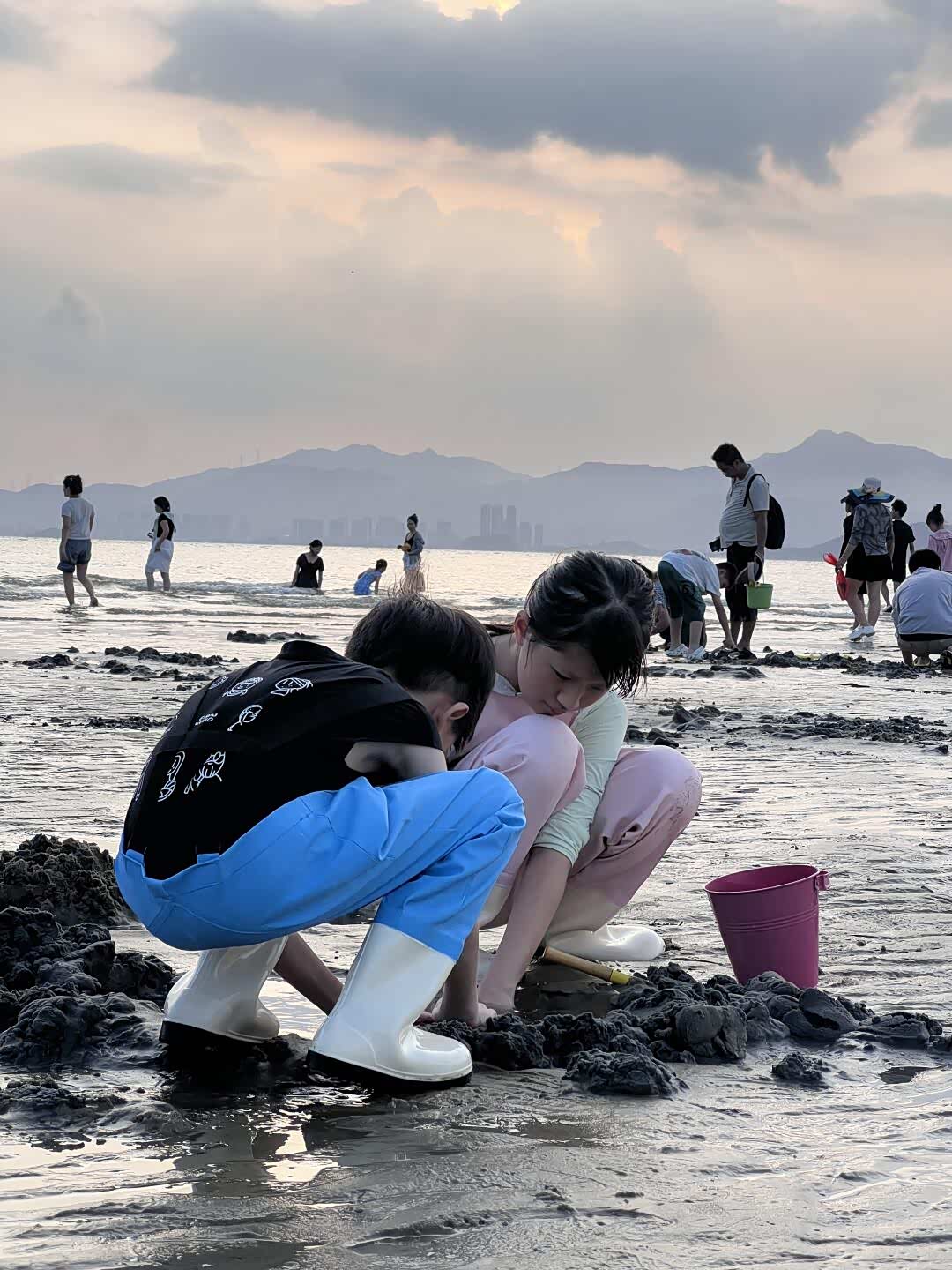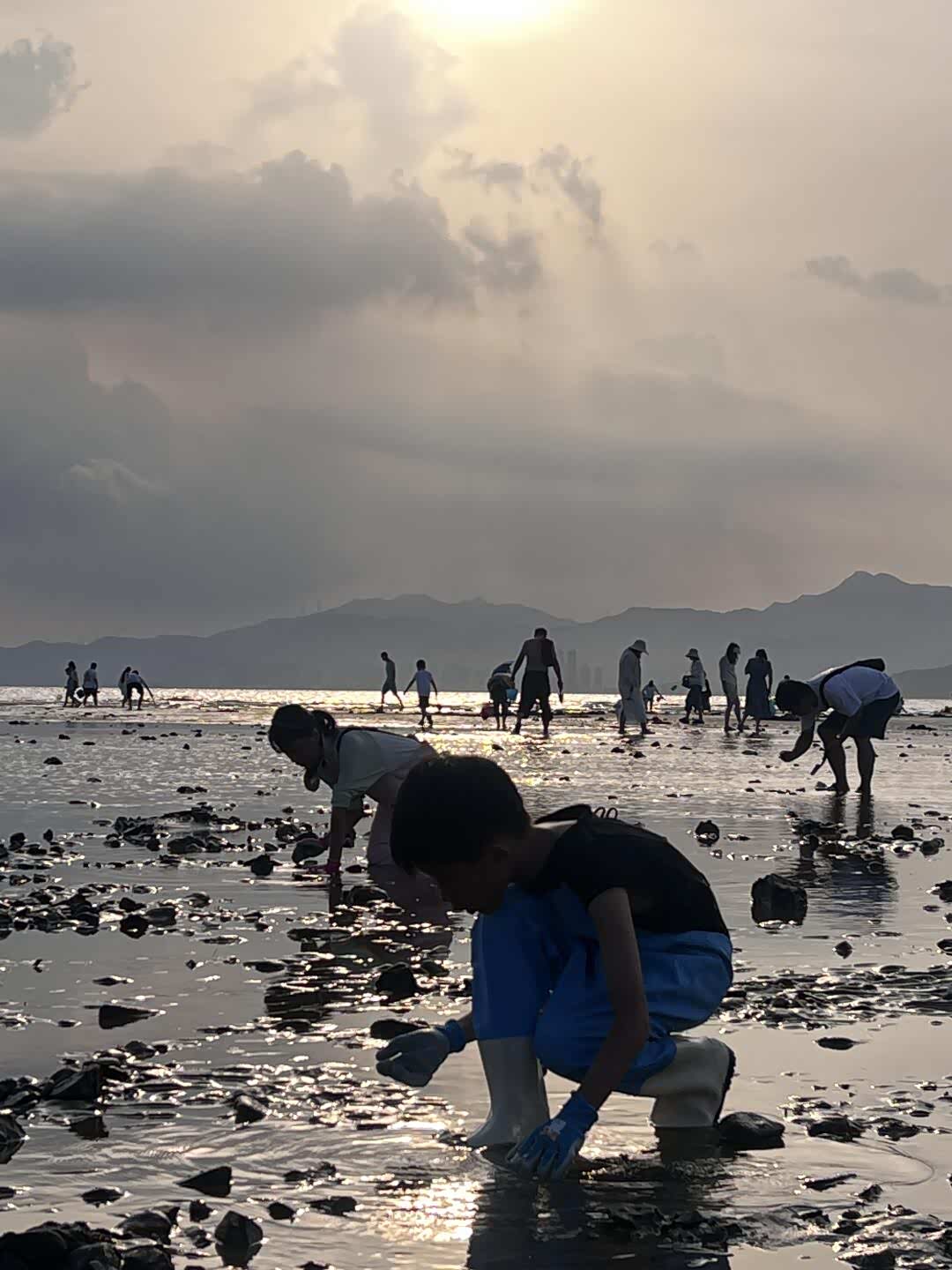 退潮后的赶海公园露出大片滩涂,跟着当地阿叔学找螃蟹洞。儿子用小铲子挖出一只花蟹,兴奋得跳起来差点摔进泥里;女儿蹲在礁石旁看寄居蟹搬家,还录了视频说要给老师看。妻子捡了枚完整的贝壳,说要串成手链给女儿戴。