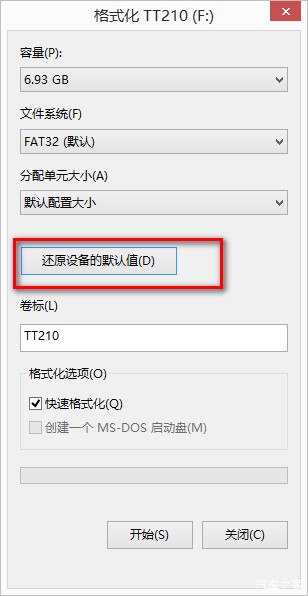 另外增加USB不能播放歌曲,被我遇到了,郁闷了好几天,开去4S,都不知道,我拿了5支U盘,才有一只能用,最后初步发现需要如下图,格式化前先 还原默认设置