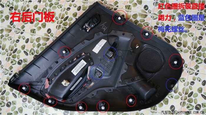拆门板注意事项:先下银色饰板和螺丝,然后拆暗扣,用力顺着拔,胆大心细,该使劲的别省力,暗扣都拔开后拔门拉手线和电线。安装时要注意先扣紧顶端玻璃胶条,再顺着按紧暗扣。