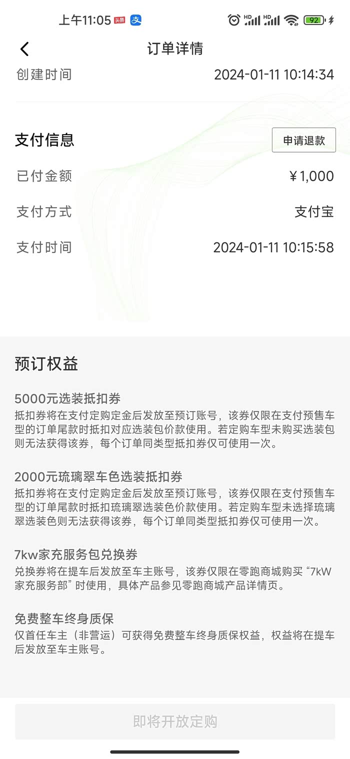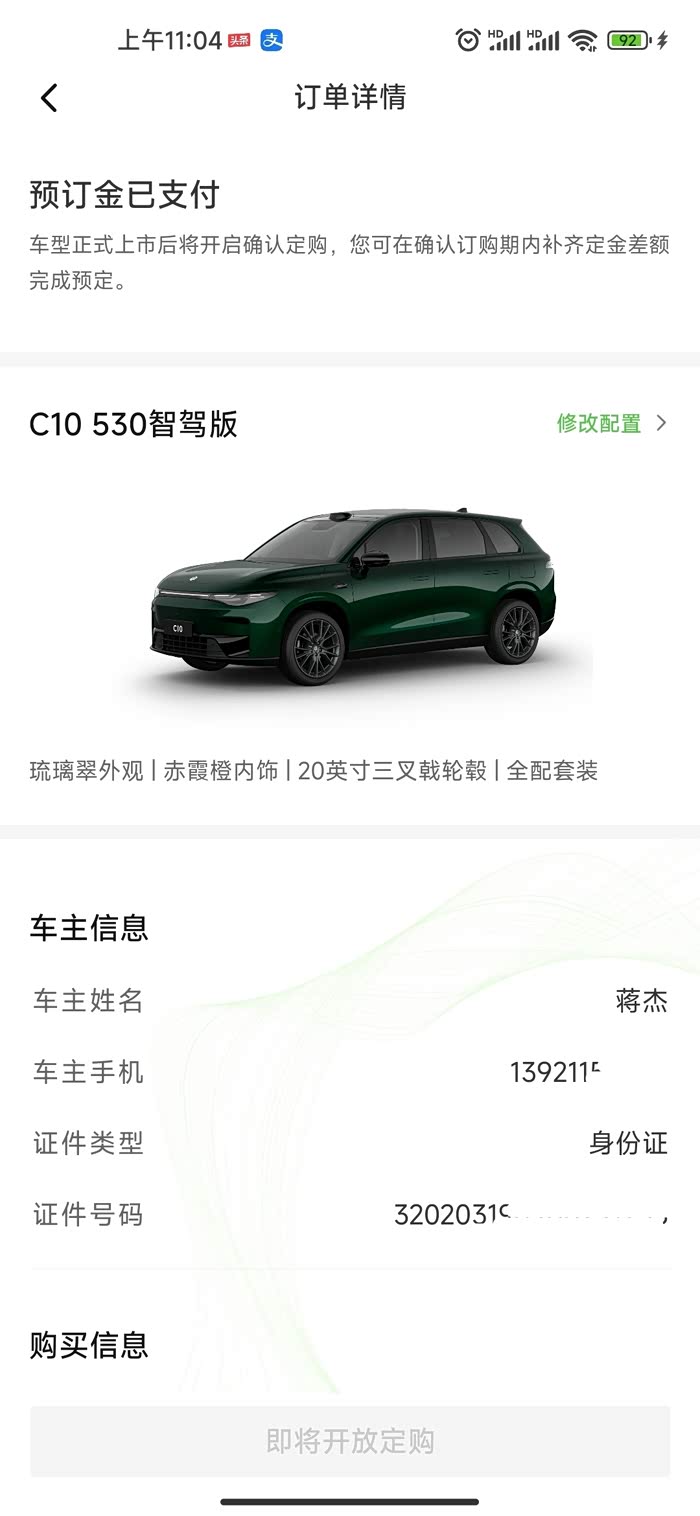 我是发布后当天盲订的,主要吸引我的就是盲订的权益整车终身质保,这是最吸引我的地方。开了C11增程这次我预定了纯电版本的C10最新配色琉璃翠搭配赤霞橙内饰的智驾版,目前还不知道加装包的选择项,相信这一款新品能够让车辆驾驶更智能、行车更安全可靠。