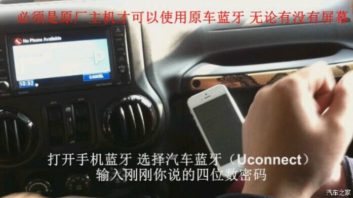 8:这个时候就可以打开手机蓝牙搜索汽车蓝牙设备,找到一个连接名字”Uconnect“,选择连接;手机提示需要密码,在手机里输入”1 1 1 1“,手机及车内屏幕提示连接成功。