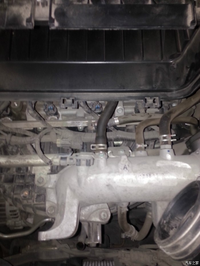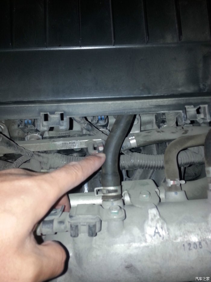 拆开后就看见曲轴箱通风管了,是直接和进气管连接的,机油蒸汽也直接进入进气道,我手指的黑色管子就是: