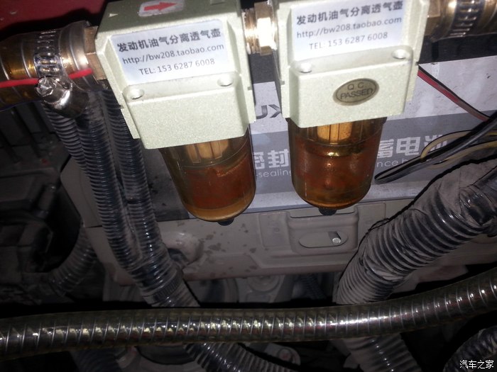 这个就是上次安装二次进气的分离器,已经跑了2000多公里后的样子,可以清楚的看到油杯里面的油了,而且不少,这些油如果直接进入气缸燃烧。产生多少积碳,而且容易堵三元催化: