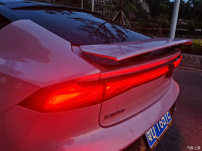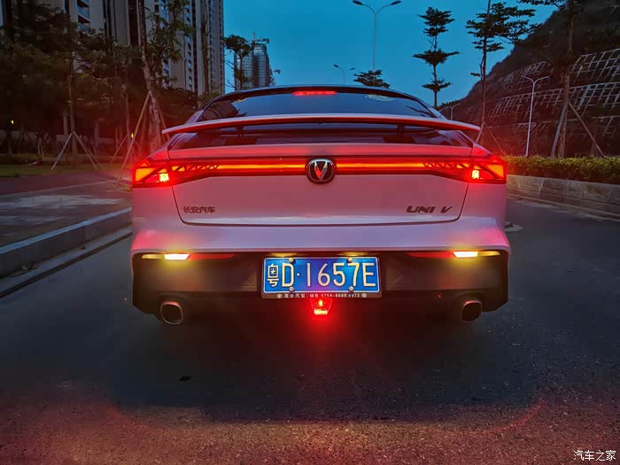 长安UNI-V的尾灯也很带感,引入眼帘的就是贯穿式尾灯,细节部分也做得很好,由多个三角形组成,极具运动风。转向灯虽然小,但是亮度十足,晚上在长安UNI-V后方很明显就能看到转向灯亮,而且在两个后视镜上也安装有两个转向灯,更加提高行车安全性。倒车灯位于车尾后方转向灯的隔壁,亮度也是够晚上倒车时照亮车尾。领航灯位于车牌的下方,形状是一个倒立的梯形,搭配上贯穿式尾灯,你就是夜晚最靓的仔。