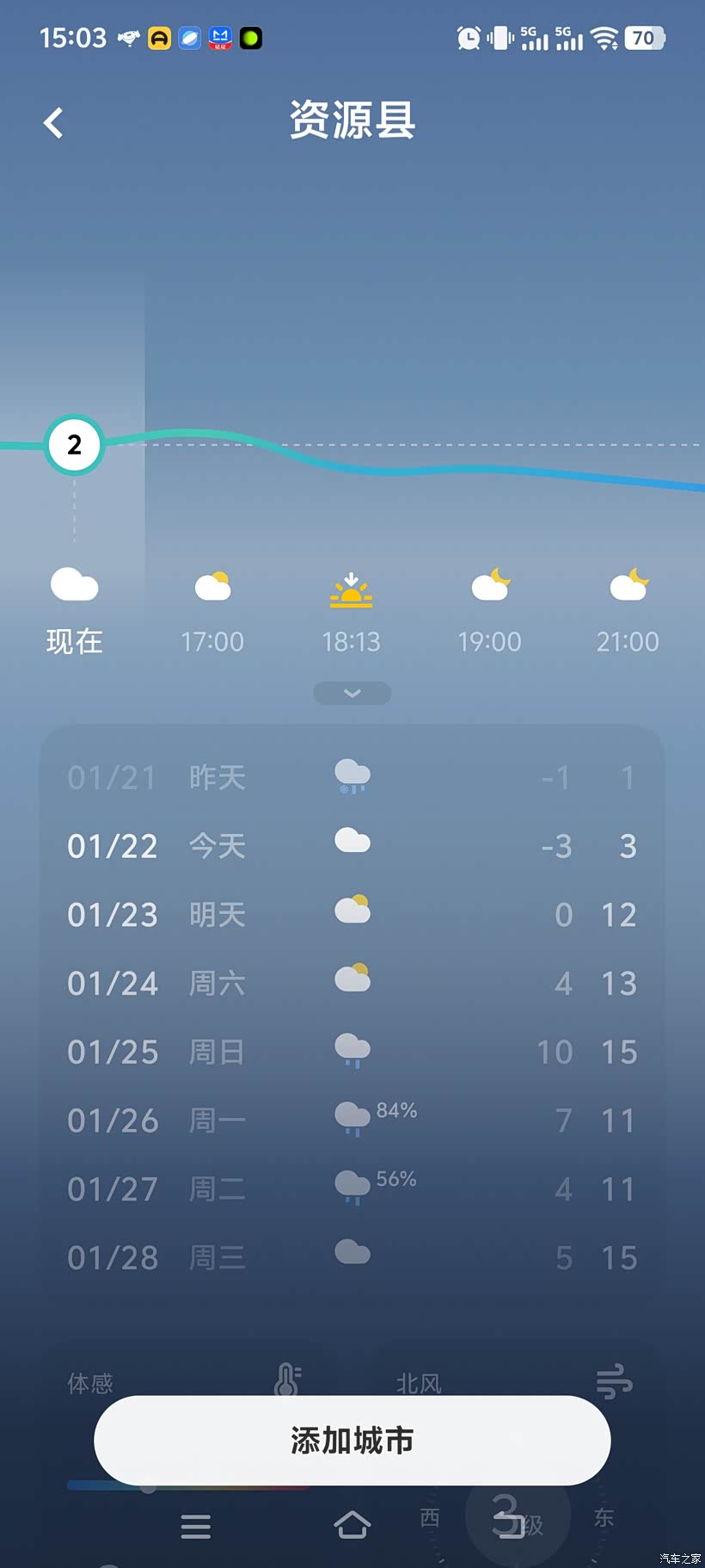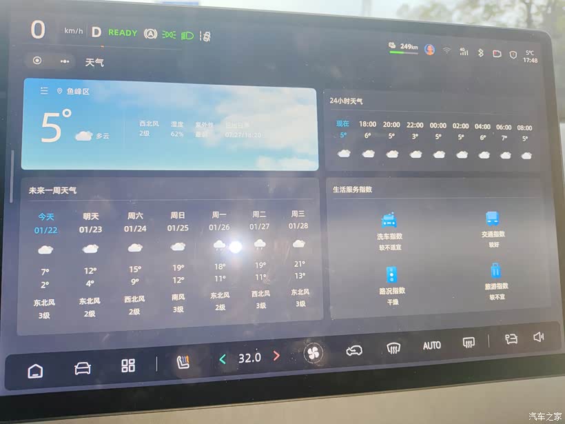 测试基本情况介绍: 连续测试一周6天的时间,单趟行程距离25公里左右,测试路段一半是快速路,一半是城区道路,正常上下班通勤时段;测试前车辆充满电,上下班通勤来回50公里,足够一周测试需求。6天平均温度4~8°,这在南方算是比较低的温度了。