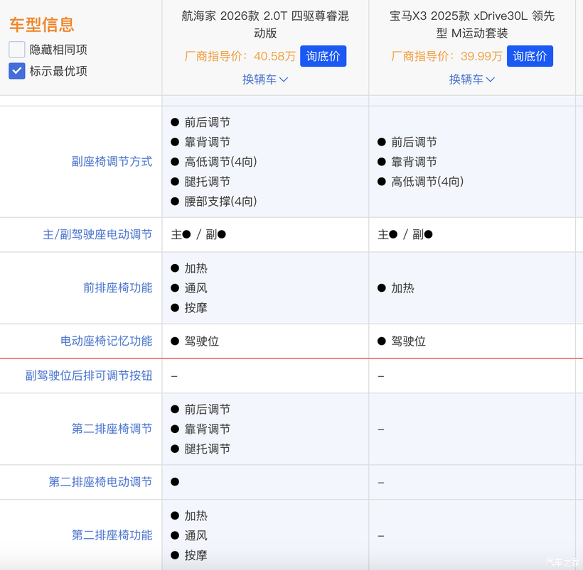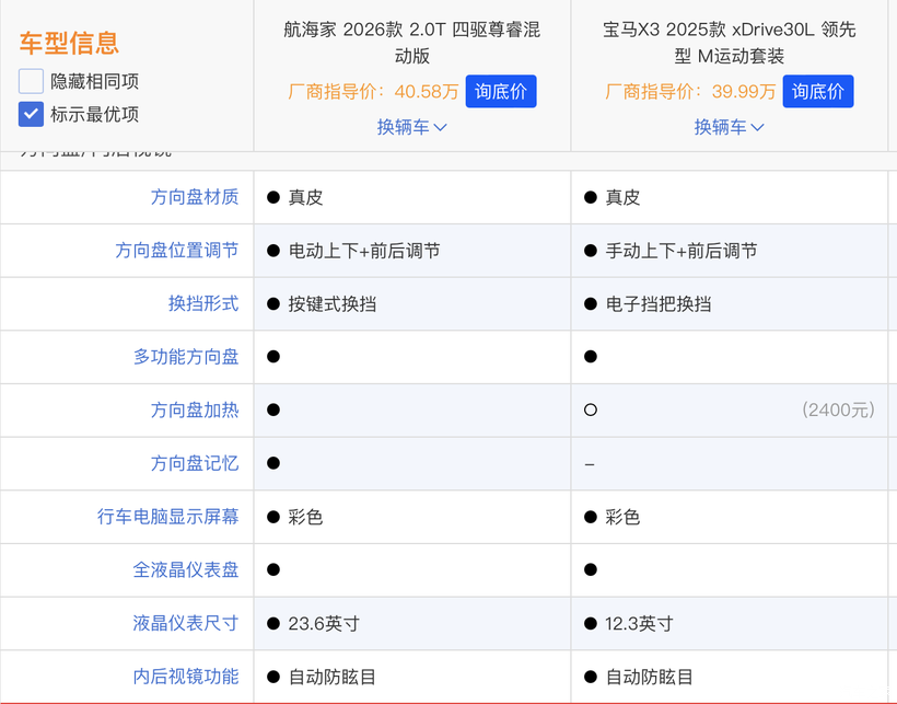 预算35 万左右,情怀让我先奔向了新 X3。本以为轴距加长后能满足家用,可实车体验却满是失望,内饰外形虽有升级,但空间没达到预期,座椅依旧偏硬,包裹感一般。最致命的是后排凸起,放个儿童座椅后,旁边只能勉强坐一人,要是全家出行后排坐三人,中间的人简直遭罪。更关键的是,家用需要的舒适配置大多要选装,想凑齐适合全家的配置,价格直接奔 40 万去,性价比实在不高。那一刻我明白,情怀再深,也抵不过家人乘车时的局促与不适。