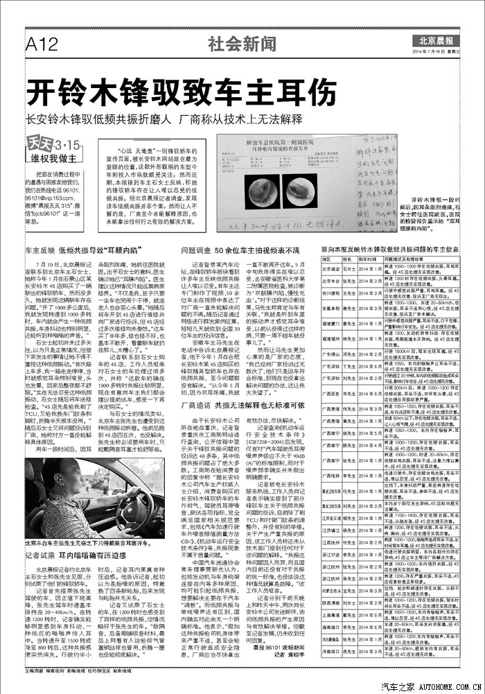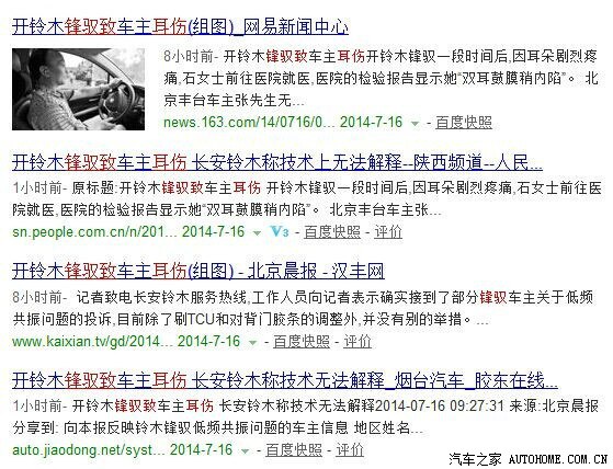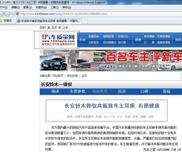 长安铃木锋驭共振致车主耳疾 有损健康2014-03-21 11:32:29 来 源:中国汽车质量网 近日收到的车主反映车辆共振问题的投诉案例数量不少,但因车辆共振而致病的案例则闻所未闻。近段时间以来,在接到的数十宗有关长安铃木锋驭的投诉中,多位车主反映此车低频共振致耳膜难受、头痛,严重者已经出现耳膜内陷的症状。而目前厂家对CVT变速箱进行程序升级的做法,车主普遍反馈,对于解决共振问题没有任何效果。投诉销量比达近46/10000 手动挡车型同样有此问题长安铃木锋驭自2013年12月上市至今,只有短短的3个月的时间。但已接到车主投诉40余宗,相比于已公布的9000余辆的销量来看,投诉销量比已...