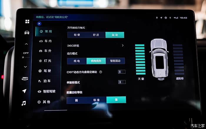 第二种是纯电优先模式,开启此模式后,仪表上的动力模式显示为纯电(绿色)。当动力电池电量充足时,优先使用纯电驱动,急加速时发动机会自动启动以提供更大的驱动力。当动力电池电量不足时,发动机会自动启动以维持动力电池电量。