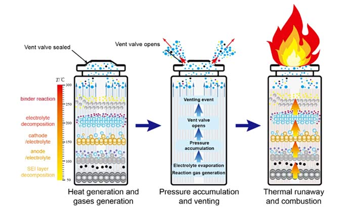 为什么电池热失控会不受控制,从单个电芯分析,三元锂电池的正极材料在300℃时就会分解、释放出氧气,遇到可燃的电解液和碳基的负极材料就会开始燃烧,升温又会进一步加剧正极材料分解,释放出更多的氧气加剧燃烧。这是一个连锁反应,就好像小时候放的鞭炮一样,一根导火索被点燃,整条鞭炮都会接连爆炸。
