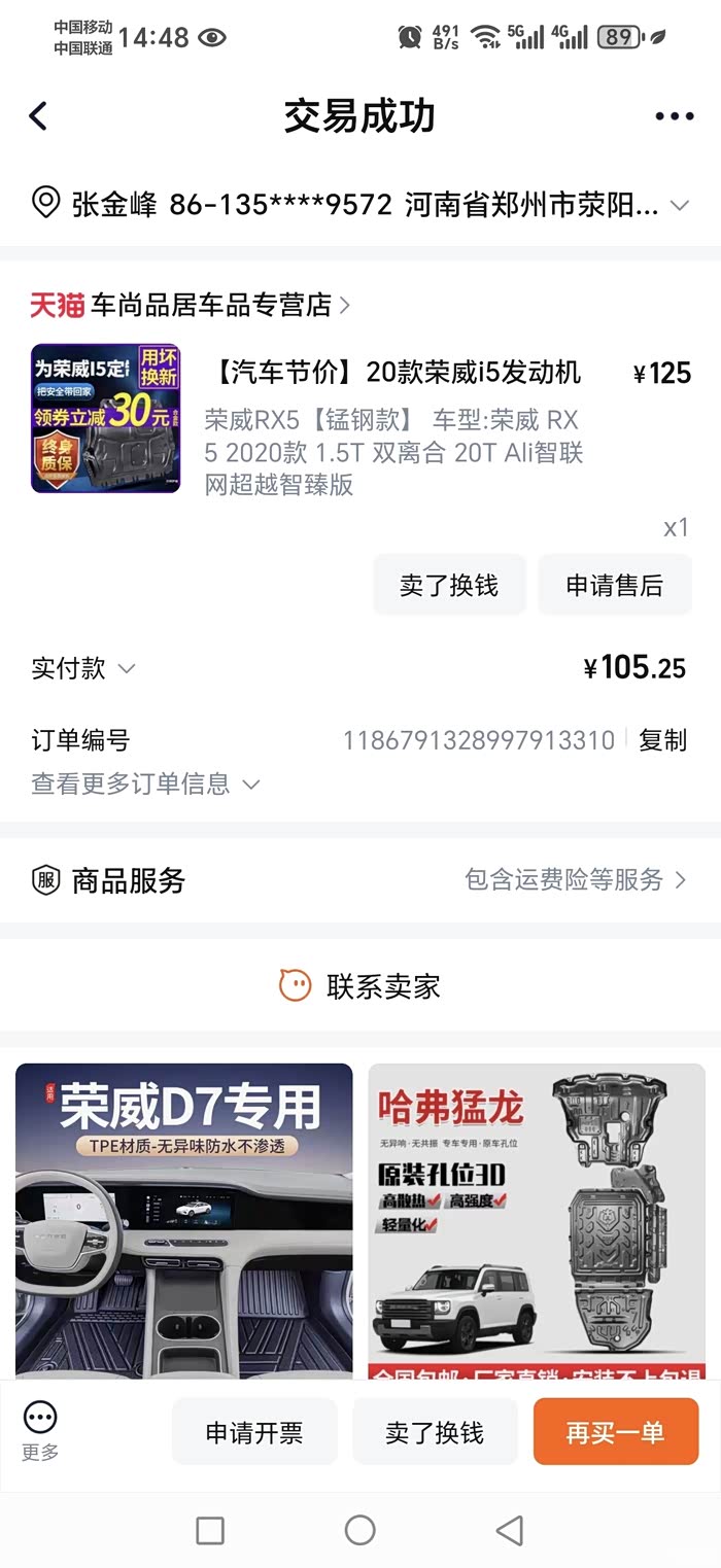 1. 牌锰钢发动机护板费用:105块钱