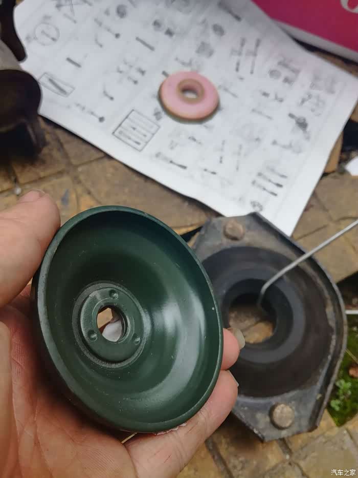 这样看就清楚了吧?从左往右我们理一理——压力轴承(粉红色塑料块)、压力轴承铁垫片、塔顶胶下铁碗(绿色飞碟)、一体式塔顶胶、塔顶胶上铁碗(八角绿色铁块,就是需要大扳手大管钳大台钳的,麻烦铁块)、塔顶螺母垫片、弹簧垫片、塔顶螺母。说明书我就不放大了,因为是老星的说明书,有出入的,他的分解可不止8个部件,仅供参考而已。我这帖子就是你们的说明书
