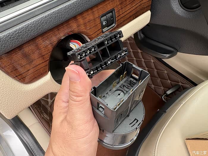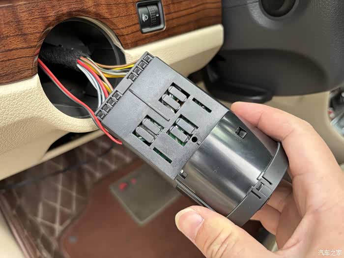 这个大灯开关是一个模块,开关模块用卡扣固定在中控台上,拆的时候,我们需要开关的拨片用力往下按住。