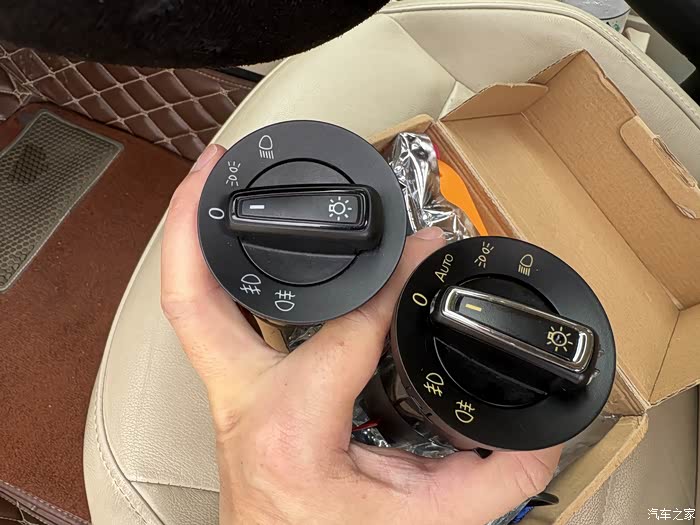 左边的是原厂大灯开关,右边的是在淘宝网上购买的非原厂自动大灯开关,放在一起对比的话,在外面上可以明显的感受到原厂大灯开关的质感更好,原厂大灯开关阻尼更好。