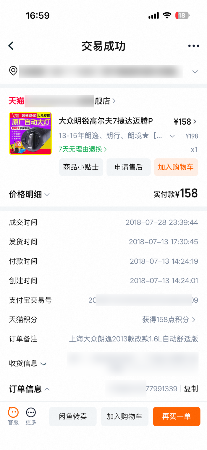 这是当年在某宝上购买的自动大灯开关的订单,当时买这个大灯开关花了158块钱,让得当年去4S店里询问过,想换一个原厂的自动大灯开关,当时店里报价要1000多,于是选择了在网上购买非原厂件回来更换。