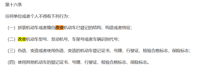 如下文,不允许擅自改变机动车已登记的结构,构造或者特征。这一条就非常宽泛,比如装保险杠,风挡,排气,手机支架等等常见改装都适用于这一条。你细品。这些是不是都涉及到,结构,构造和特征。当然关于已登记的意思就是我们所说的系统目录信息。包括图片。很多人上牌时候都见过吧,警察叔叔拿着打印的资料或者PDA对照查验车辆外观。甚至我还遇到过有些地方非常严格,用皮尺量。