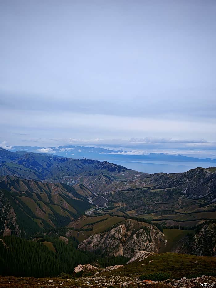 登上了最后的天然观景台,眺望伊犁山脉,再往前看,就能看到果子沟大桥、赛里木湖、连绵不断的山峰,感受到山巅的清凉,给人一种视觉和感官上的冲击。最后这个坡还是挺陡的,嗯,打开4驱,握好方向,稳住油门,剩下的你就交给40。我们便能看到果子沟大桥和赛里木湖同框了。